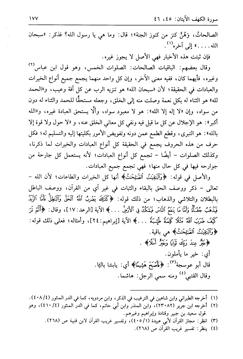 والأصل في قوله: (وَالْبَاقِيَاتُ الصَّالِحَاتُ) أنها كل الخيرات والطاعات؛ لأن اللَّه - تعالى - ذكر ووصف الحق بالبقاء والثبات في غير آي من القرآن، ووصف الباطل بالبطلان والتلاشي والذهاب؛ من ذلك قوله: (كَذَلِكَ يَضْرِبُ اللَّهُ الْحَقَّ وَالْبَاطِلَ فَأَمَّا الزَّبَدُ فَيَذْهَبُ جُفَاءً وَأَمَّا مَا يَنْفَعُ النَّاسَ فَيَمْكُثُ فِي الْأَرْضِ. . .) الآية، وقال: (أَلَمْ تَرَ كَيْفَ ضَرَبَ اللَّهُ مَثَلًا كَلِمَةً طَيِّبَةً. . .) الآية، وأمثاله؛ فعلى ذلك قوله: (وَالْبَاقِيَاتُ الصَّالِحَاتُ) هي باقية.