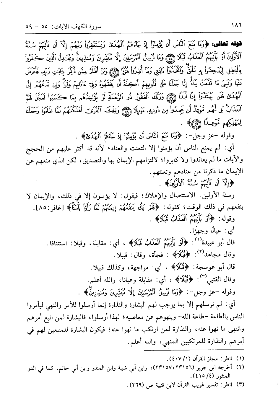 قوله تعالى: (وَمَا مَنَعَ النَّاسَ أَنْ يُؤْمِنُوا إِذْ جَاءَهُمُ الْهُدَى وَيَسْتَغْفِرُوا رَبَّهُمْ إِلَّا أَنْ تَأْتِيَهُمْ سُنَّةُ الْأَوَّلِينَ أَوْ يَأْتِيَهُمُ الْعَذَابُ قُبُلًا (55) وَمَا نُرْسِلُ الْمُرْسَلِينَ إِلَّا مُبَشِّرِينَ وَمُنْذِرِينَ وَيُجَادِلُ الَّذِينَ كَفَرُوا بِالْبَاطِلِ لِيُدْحِضُوا بِهِ الْحَقَّ وَاتَّخَذُوا آيَاتِي وَمَا أُنْذِرُوا هُزُوًا (56) وَمَنْ أَظْلَمُ مِمَّنْ ذُكِّرَ بِآيَاتِ رَبِّهِ فَأَعْرَضَ عَنْهَا وَنَسِيَ مَا قَدَّمَتْ يَدَاهُ إِنَّا جَعَلْنَا عَلَى قُلُوبِهِمْ أَكِنَّةً أَنْ يَفْقَهُوهُ وَفِي آذَانِهِمْ وَقْرًا وَإِنْ تَدْعُهُمْ إِلَى الْهُدَى فَلَنْ يَهْتَدُوا إِذًا أَبَدًا (57) وَرَبُّكَ الْغَفُورُ ذُو الرَّحْمَةِ لَوْ يُؤَاخِذُهُمْ بِمَا كَسَبُوا لَعَجَّلَ لَهُمُ الْعَذَابَ بَلْ لَهُمْ مَوْعِدٌ لَنْ يَجِدُوا مِنْ دُونِهِ مَوْئِلًا (58) وَتِلْكَ الْقُرَى أَهْلَكْنَاهُمْ لَمَّا ظَلَمُوا وَجَعَلْنَا لِمَهْلِكِهِمْ مَوْعِدًا (59)