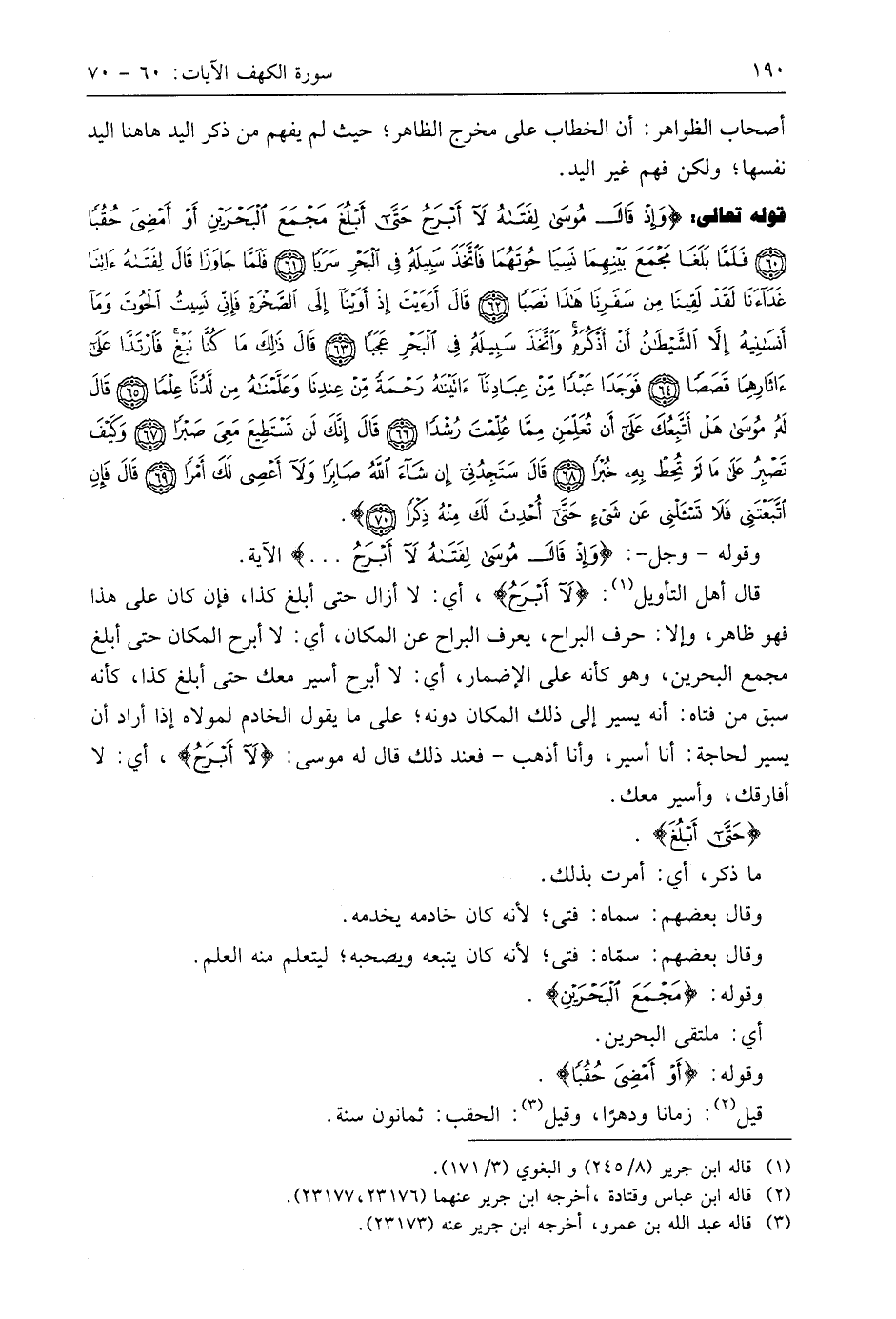 قوله تعالى: (وَإِذْ قَالَ مُوسَى لِفَتَاهُ لَا أَبْرَحُ حَتَّى أَبْلُغَ مَجْمَعَ الْبَحْرَيْنِ أَوْ أَمْضِيَ حُقُبًا (60) فَلَمَّا بَلَغَا مَجْمَعَ بَيْنِهِمَا نَسِيَا حُوتَهُمَا فَاتَّخَذَ سَبِيلَهُ فِي الْبَحْرِ سَرَبًا (61) فَلَمَّا جَاوَزَا قَالَ لِفَتَاهُ آتِنَا غَدَاءَنَا لَقَدْ لَقِينَا مِنْ سَفَرِنَا هَذَا نَصَبًا (62) قَالَ أَرَأَيْتَ إِذْ أَوَيْنَا إِلَى الصَّخْرَةِ فَإِنِّي نَسِيتُ الْحُوتَ وَمَا أَنْسَانِيهُ إِلَّا الشَّيْطَانُ أَنْ أَذْكُرَهُ وَاتَّخَذَ سَبِيلَهُ فِي الْبَحْرِ عَجَبًا (63) قَالَ ذَلِكَ مَا كُنَّا نَبْغِ فَارْتَدَّا عَلَى آثَارِهِمَا قَصَصًا (64) فَوَجَدَا عَبْدًا مِنْ عِبَادِنَا آتَيْنَاهُ رَحْمَةً مِنْ عِنْدِنَا وَعَلَّمْنَاهُ مِنْ لَدُنَّا عِلْمًا (65) قَالَ لَهُ مُوسَى هَلْ أَتَّبِعُكَ عَلَى أَنْ تُعَلِّمَنِ مِمَّا عُلِّمْتَ رُشْدًا (66) قَالَ إِنَّكَ لَنْ تَسْتَطِيعَ مَعِيَ صَبْرًا (67) وَكَيْفَ تَصْبِرُ عَلَى مَا لَمْ تُحِطْ بِهِ خُبْرًا (68) قَالَ سَتَجِدُنِي إِنْ شَاءَ اللَّهُ صَابِرًا وَلَا أَعْصِي لَكَ أَمْرًا (69) قَالَ فَإِنِ اتَّبَعْتَنِي فَلَا تَسْأَلْنِي عَنْ شَيْءٍ حَتَّى أُحْدِثَ لَكَ مِنْهُ ذِكْرًا (70)