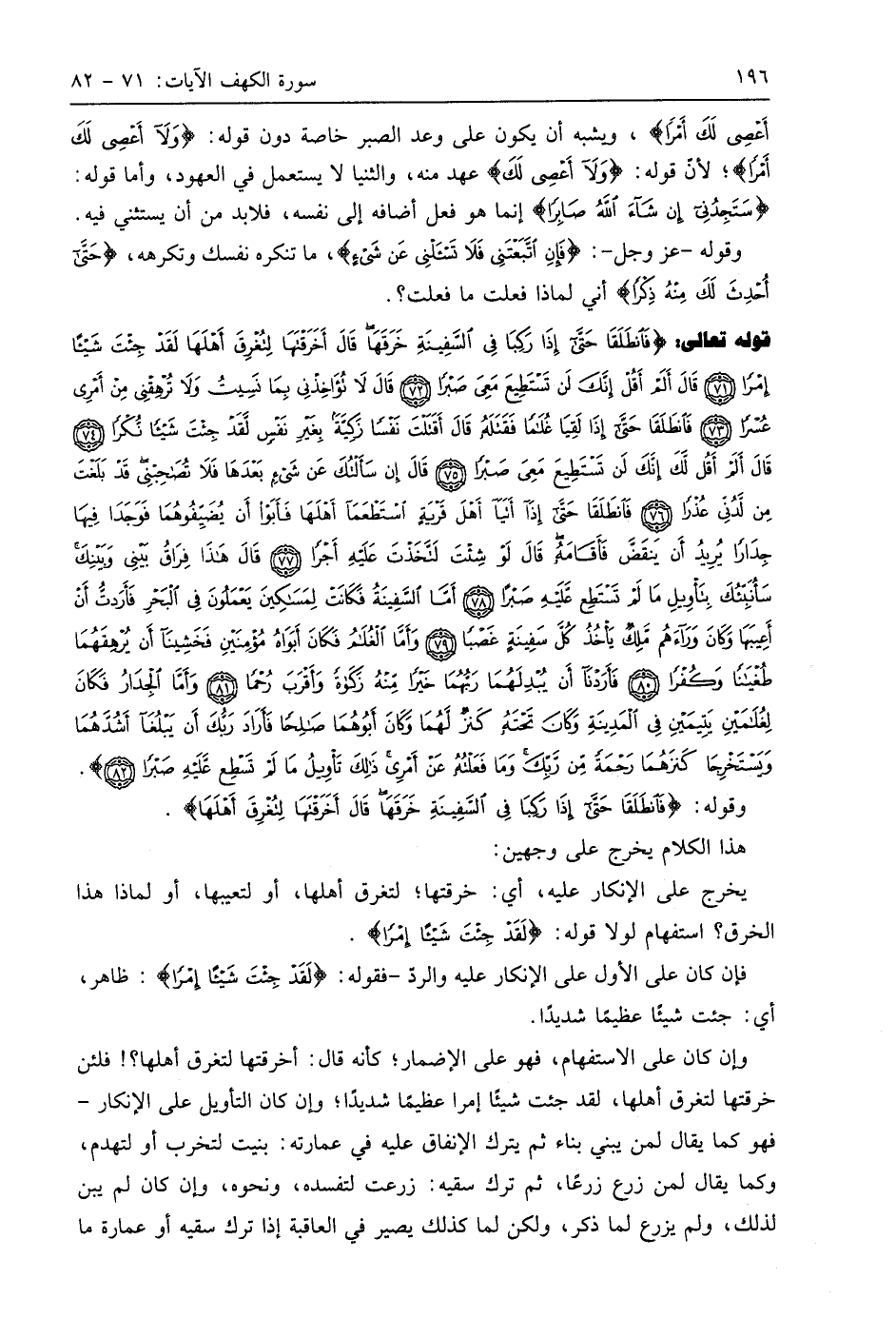 قوله تعالى: (فَانْطَلَقَا حَتَّى إِذَا رَكِبَا فِي السَّفِينَةِ خَرَقَهَا قَالَ أَخَرَقْتَهَا لِتُغْرِقَ أَهْلَهَا لَقَدْ جِئْتَ شَيْئًا إِمْرًا (71) قَالَ أَلَمْ أَقُلْ إِنَّكَ لَنْ تَسْتَطِيعَ مَعِيَ صَبْرًا (72) قَالَ لَا تُؤَاخِذْنِي بِمَا نَسِيتُ وَلَا تُرْهِقْنِي مِنْ أَمْرِي عُسْرًا (73) فَانْطَلَقَا حَتَّى إِذَا لَقِيَا غُلَامًا فَقَتَلَهُ قَالَ أَقَتَلْتَ نَفْسًا زَكِيَّةً بِغَيْرِ نَفْسٍ لَقَدْ جِئْتَ شَيْئًا نُكْرًا (74) قَالَ أَلَمْ أَقُلْ لَكَ إِنَّكَ لَنْ تَسْتَطِيعَ مَعِيَ صَبْرًا (75) قَالَ إِنْ سَأَلْتُكَ عَنْ شَيْءٍ بَعْدَهَا فَلَا تُصَاحِبْنِي قَدْ بَلَغْتَ مِنْ لَدُنِّي عُذْرًا (76) فَانْطَلَقَا حَتَّى إِذَا أَتَيَا أَهْلَ قَرْيَةٍ اسْتَطْعَمَا أَهْلَهَا فَأَبَوْا أَنْ يُضَيِّفُوهُمَا فَوَجَدَا فِيهَا جِدَارًا يُرِيدُ أَنْ يَنْقَضَّ فَأَقَامَهُ قَالَ لَوْ شِئْتَ لَاتَّخَذْتَ عَلَيْهِ أَجْرًا (77) قَالَ هَذَا فِرَاقُ بَيْنِي وَبَيْنِكَ سَأُنَبِّئُكَ بِتَأْوِيلِ مَا لَمْ تَسْتَطِعْ عَلَيْهِ صَبْرًا (78) أَمَّا السَّفِينَةُ فَكَانَتْ لِمَسَاكِينَ يَعْمَلُونَ فِي الْبَحْرِ فَأَرَدْتُ أَنْ أَعِيبَهَا وَكَانَ وَرَاءَهُمْ مَلِكٌ يَأْخُذُ كُلَّ سَفِينَةٍ غَصْبًا (79) وَأَمَّا الْغُلَامُ فَكَانَ أَبَوَاهُ مُؤْمِنَيْنِ فَخَشِينَا أَنْ يُرْهِقَهُمَا طُغْيَانًا وَكُفْرًا (80) فَأَرَدْنَا أَنْ يُبْدِلَهُمَا رَبُّهُمَا خَيْرًا مِنْهُ زَكَاةً وَأَقْرَبَ رُحْمًا (81) وَأَمَّا الْجِدَارُ فَكَانَ لِغُلَامَيْنِ يَتِيمَيْنِ فِي الْمَدِينَةِ وَكَانَ تَحْتَهُ كَنْزٌ لَهُمَا وَكَانَ أَبُوهُمَا صَالِحًا فَأَرَادَ رَبُّكَ أَنْ يَبْلُغَا أَشُدَّهُمَا وَيَسْتَخْرِجَا كَنْزَهُمَا رَحْمَةً مِنْ رَبِّكَ وَمَا فَعَلْتُهُ عَنْ أَمْرِي ذَلِكَ تَأْوِيلُ مَا لَمْ تَسْطِعْ عَلَيْهِ صَبْرًا (82)