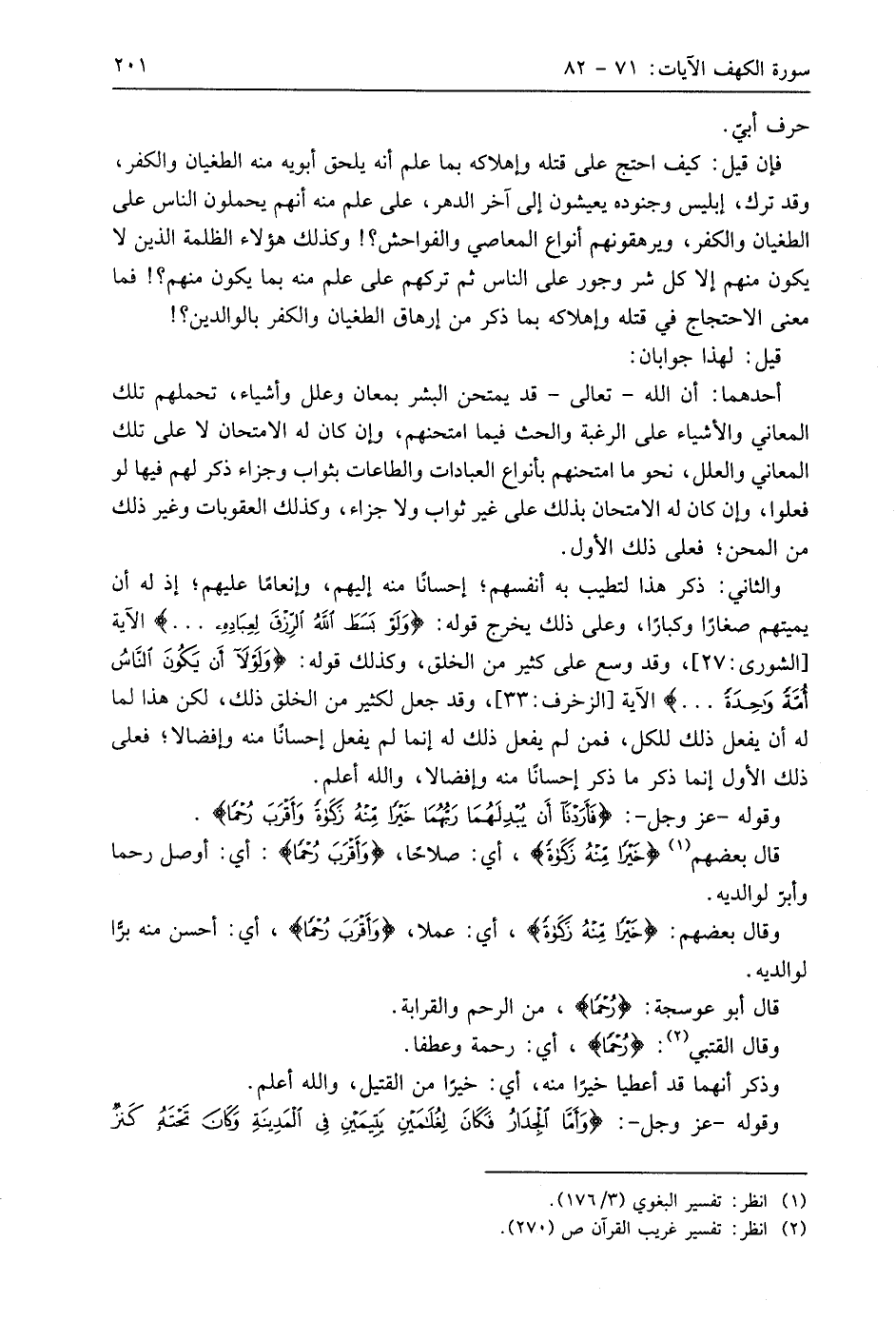 فَإِنْ قِيلَ: كيف احتج على قتله وإهلاكه بما علم أنه يلحق أبويه منه الطغيان والكفر، وقد ترك، إبليس وجنوده يعيشون إلى آخر الدهر، على علم منه أنهم يحملون الناس على الطغيان والكفر، ويرهقونهم أنواع المعاصي والفواحش؟! وكذلك هَؤُلَاءِ الظلمة الذين لا يكون منهم إلا كل شر وجور على الناس ثم تركهم على علم منه بما يكون منهم؟! فما معنى الاحتجاج في قتله وإهلاكه بما ذكر من إرهاق الطغيان والكفر بالوالدين؟!
