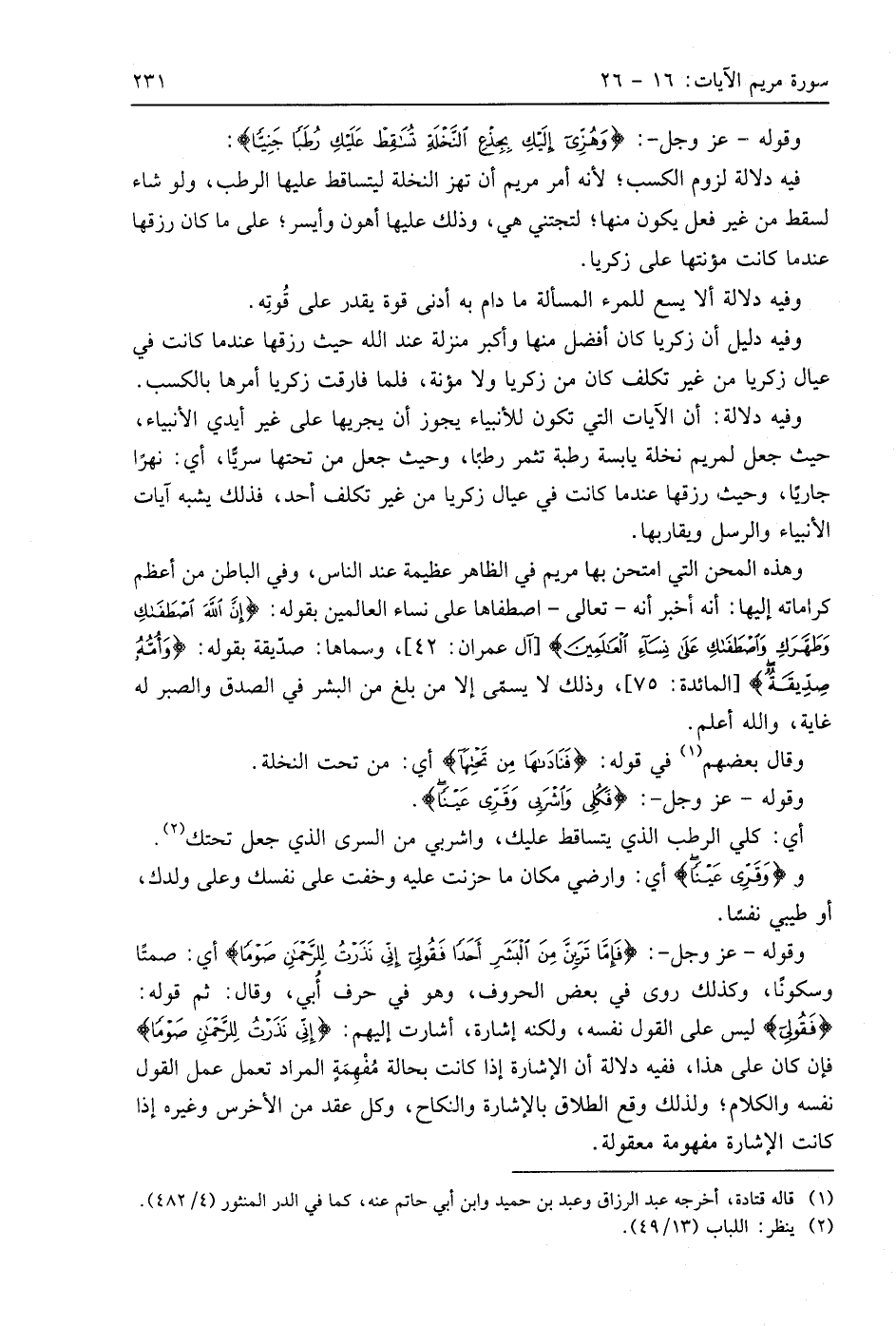 وقوله - عَزَّ وَجَلَّ -: (فَكُلِي وَاشْرَبِي وَقَرِّي عَيْنًا فَإِمَّا تَرَيِنَّ مِنَ الْبَشَرِ أَحَدًا فَقُولِي إِنِّي نَذَرْتُ لِلرَّحْمَنِ صَوْمًا فَلَنْ أُكَلِّمَ الْيَوْمَ إِنْسِيًّا (26)