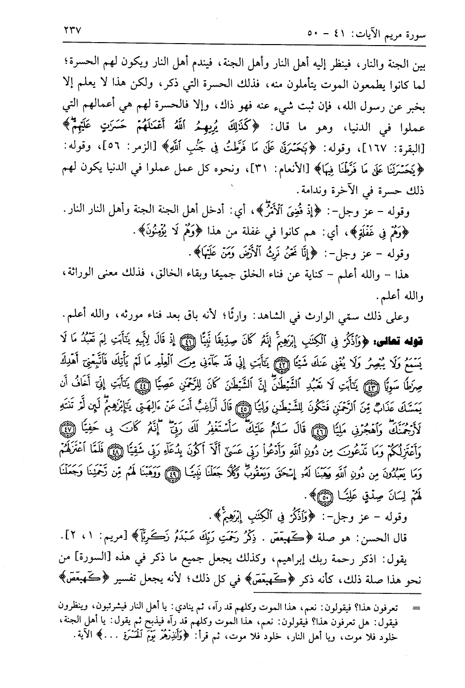 قوله تعالى: (وَاذْكُرْ فِي الْكِتَابِ إِبْرَاهِيمَ إِنَّهُ كَانَ صِدِّيقًا نَبِيًّا (41) إِذْ قَالَ لِأَبِيهِ يَا أَبَتِ لِمَ تَعْبُدُ مَا لَا يَسْمَعُ وَلَا يُبْصِرُ وَلَا يُغْنِي عَنْكَ شَيْئًا (42) يَا أَبَتِ إِنِّي قَدْ جَاءَنِي مِنَ الْعِلْمِ مَا لَمْ يَأْتِكَ فَاتَّبِعْنِي أَهْدِكَ صِرَاطًا سَوِيًّا (43) يَا أَبَتِ لَا تَعْبُدِ الشَّيْطَانَ إِنَّ الشَّيْطَانَ كَانَ لِلرَّحْمَنِ عَصِيًّا (44) يَا أَبَتِ إِنِّي أَخَافُ أَنْ يَمَسَّكَ عَذَابٌ مِنَ الرَّحْمَنِ فَتَكُونَ لِلشَّيْطَانِ وَلِيًّا (45) قَالَ أَرَاغِبٌ أَنْتَ عَنْ آلِهَتِي يَا إِبْرَاهِيمُ لَئِنْ لَمْ تَنْتَهِ لَأَرْجُمَنَّكَ وَاهْجُرْنِي مَلِيًّا (46) قَالَ سَلَامٌ عَلَيْكَ سَأَسْتَغْفِرُ لَكَ رَبِّي إِنَّهُ كَانَ بِي حَفِيًّا (47) وَأَعْتَزِلُكُمْ وَمَا تَدْعُونَ مِنْ دُونِ اللَّهِ وَأَدْعُو رَبِّي عَسَى أَلَّا أَكُونَ بِدُعَاءِ رَبِّي شَقِيًّا (48) فَلَمَّا اعْتَزَلَهُمْ وَمَا يَعْبُدُونَ مِنْ دُونِ اللَّهِ وَهَبْنَا لَهُ إِسْحَاقَ وَيَعْقُوبَ وَكُلًّا جَعَلْنَا نَبِيًّا (49) وَوَهَبْنَا لَهُمْ مِنْ رَحْمَتِنَا وَجَعَلْنَا لَهُمْ لِسَانَ صِدْقٍ عَلِيًّا (50)
