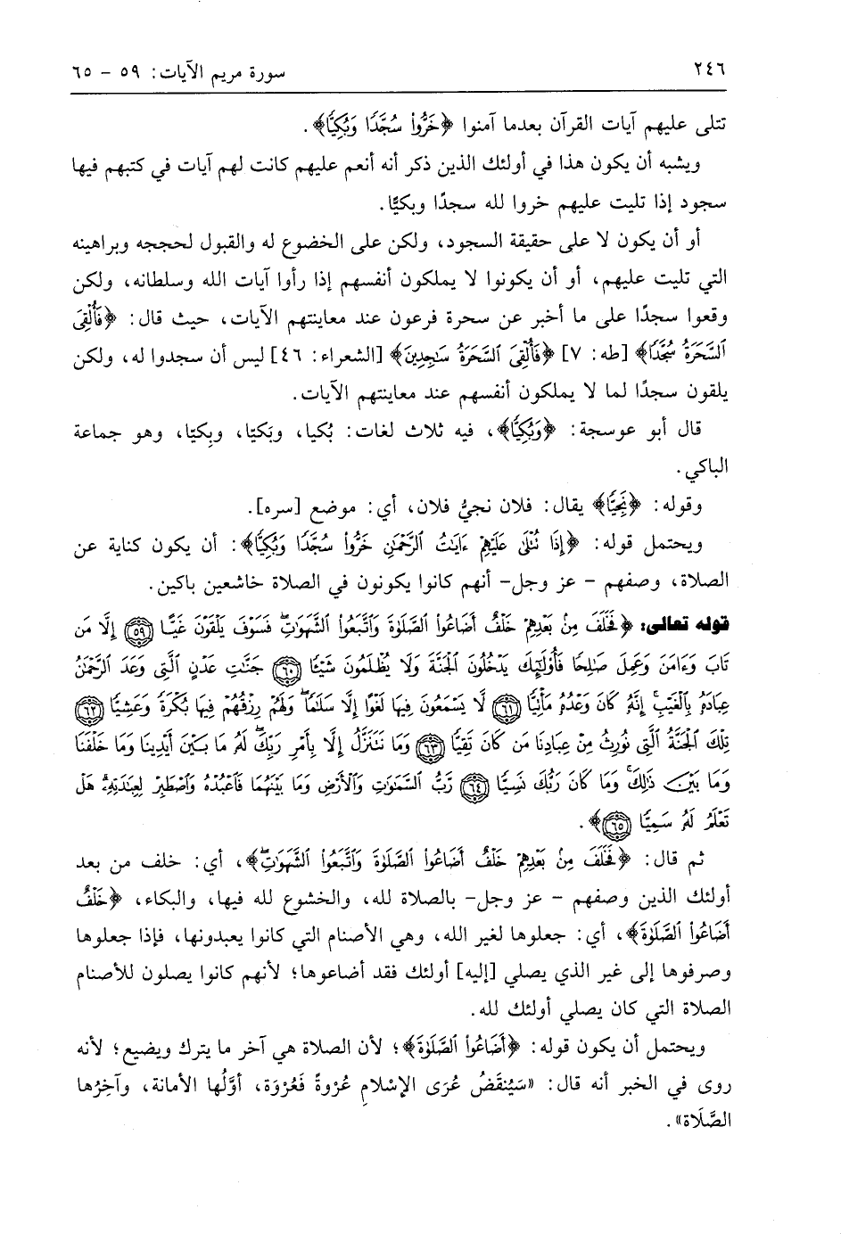 قوله تعالى: (فَخَلَفَ مِنْ بَعْدِهِمْ خَلْفٌ أَضَاعُوا الصَّلَاةَ وَاتَّبَعُوا الشَّهَوَاتِ فَسَوْفَ يَلْقَوْنَ غَيًّا (59) إِلَّا مَنْ تَابَ وَآمَنَ وَعَمِلَ صَالِحًا فَأُولَئِكَ يَدْخُلُونَ الْجَنَّةَ وَلَا يُظْلَمُونَ شَيْئًا (60) جَنَّاتِ عَدْنٍ الَّتِي وَعَدَ الرَّحْمَنُ عِبَادَهُ بِالْغَيْبِ إِنَّهُ كَانَ وَعْدُهُ مَأْتِيًّا (61) لَا يَسْمَعُونَ فِيهَا لَغْوًا إِلَّا سَلَامًا وَلَهُمْ رِزْقُهُمْ فِيهَا بُكْرَةً وَعَشِيًّا (62) تِلْكَ الْجَنَّةُ الَّتِي نُورِثُ مِنْ عِبَادِنَا مَنْ كَانَ تَقِيًّا (63) وَمَا نَتَنَزَّلُ إِلَّا بِأَمْرِ رَبِّكَ لَهُ مَا بَيْنَ أَيْدِينَا وَمَا خَلْفَنَا وَمَا بَيْنَ ذَلِكَ وَمَا كَانَ رَبُّكَ نَسِيًّا (64) رَبُّ السَّمَاوَاتِ وَالْأَرْضِ وَمَا بَيْنَهُمَا فَاعْبُدْهُ وَاصْطَبِرْ لِعِبَادَتِهِ هَلْ تَعْلَمُ لَهُ سَمِيًّا (65)