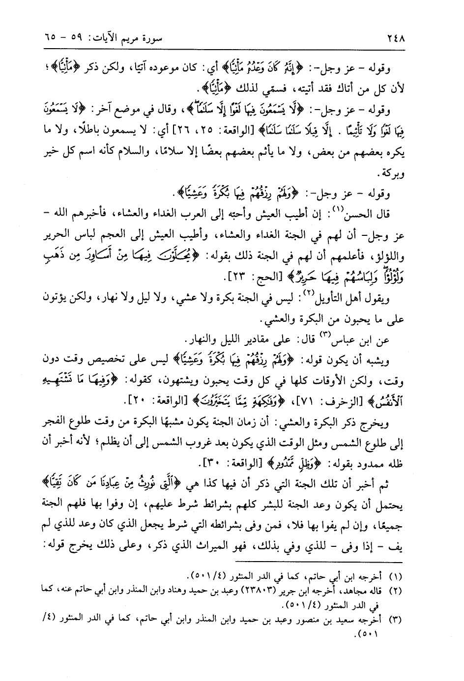 ويشبه أن يكون قوله: (وَلَهُمْ رِزْقُهُمْ فِيهَا بُكْرَةً وَعَشِيًّا) ليس على تخصيص وقت دون وقت، ولكن الأوقات كلها في كل وقت يحبون ويشتهون، كقوله: (وَفِيهَا مَا تَشْتَهِيهِ الْأَنْفُسُ)، (وَفَاكِهَةٍ مِمَّا يَتَخَيَّرُونَ).
