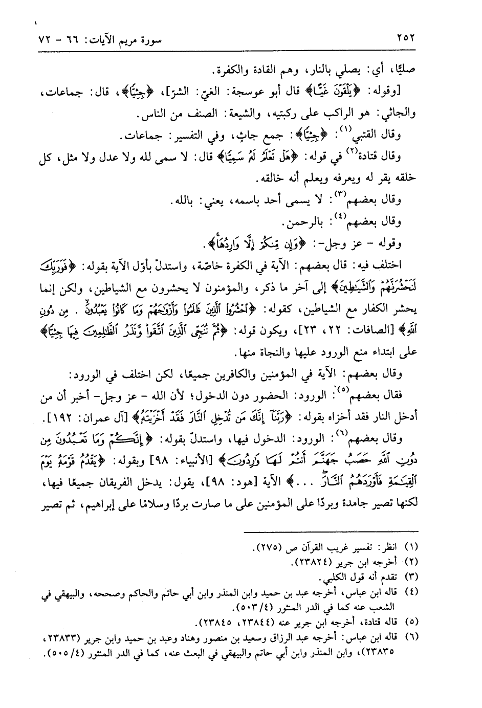 وقَالَ الْقُتَبِيُّ: (جِثِيًّا): جمع جاثٍ، وفي التفسير: جماعات.
