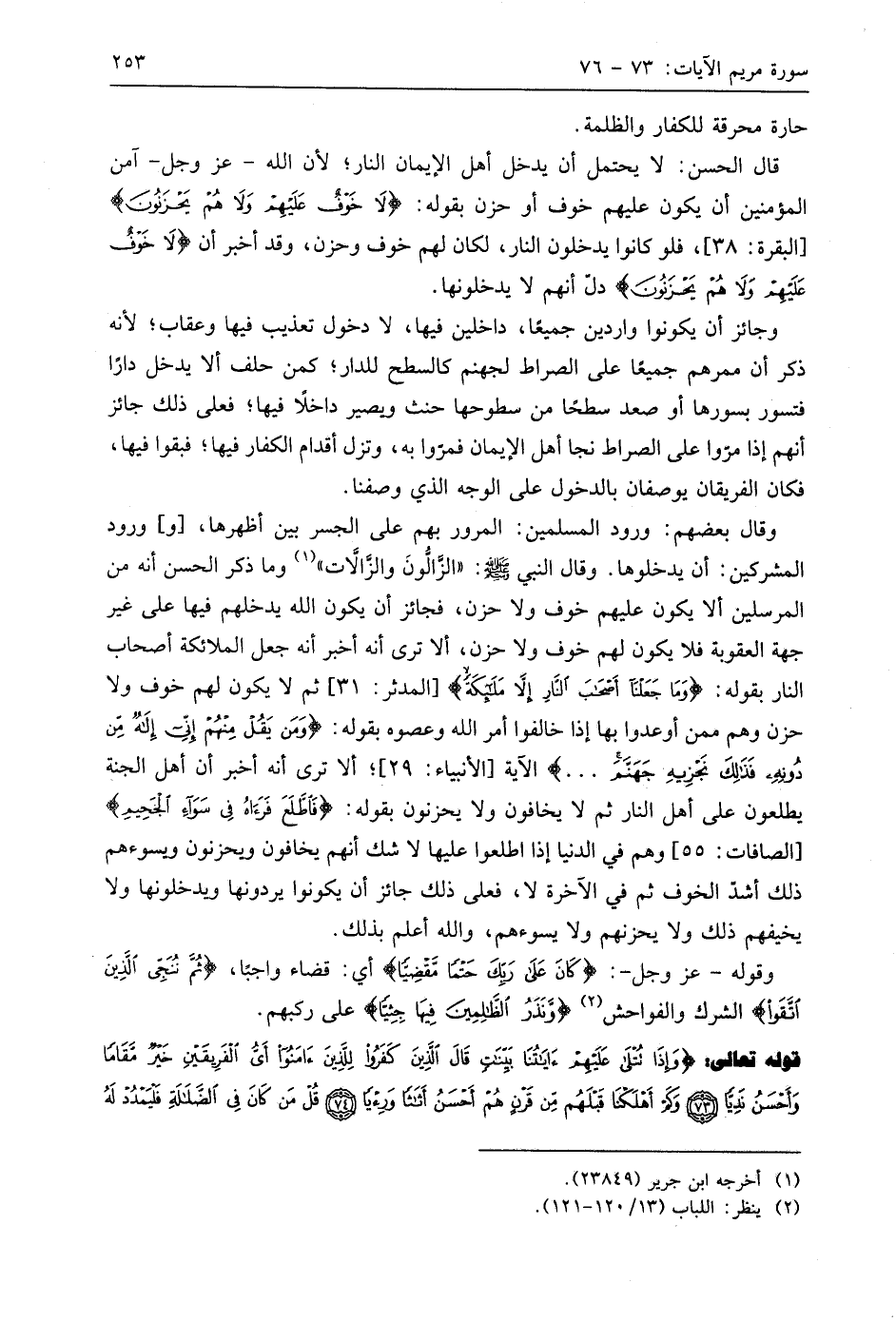 وجائز أن يكونوا واردين جميعًا، داخلين فيها، لا دخول تعذيب فيها وعقاب؛ لأنه ذكر أن ممرهم جميعًا على الصراط لجهنم كالسطح للدار؛ كمن حلف ألا يدخل دارًا فتسور بسورها أو صعد سطحًا من سطوحها حنث ويصير داخلًا فيها؛ فعلى ذلك جائز أنهم إذا مروا على الصراط نجا أهل الإيمان فمروا به، وتزل أقدام الكفار فيها؛ فبقوا فيها، فكان الفريقان يوصفان بالدخول على الوجه الذي وصفنا.
