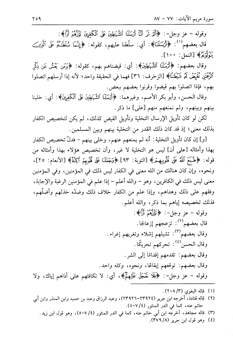 وقوله - عَزَّ وَجَلَّ -: (أَلَمْ تَرَ أَنَّا أَرْسَلْنَا الشَّيَاطِينَ عَلَى الْكَافِرِينَ تَؤُزُّهُمْ أَزًّا (83)