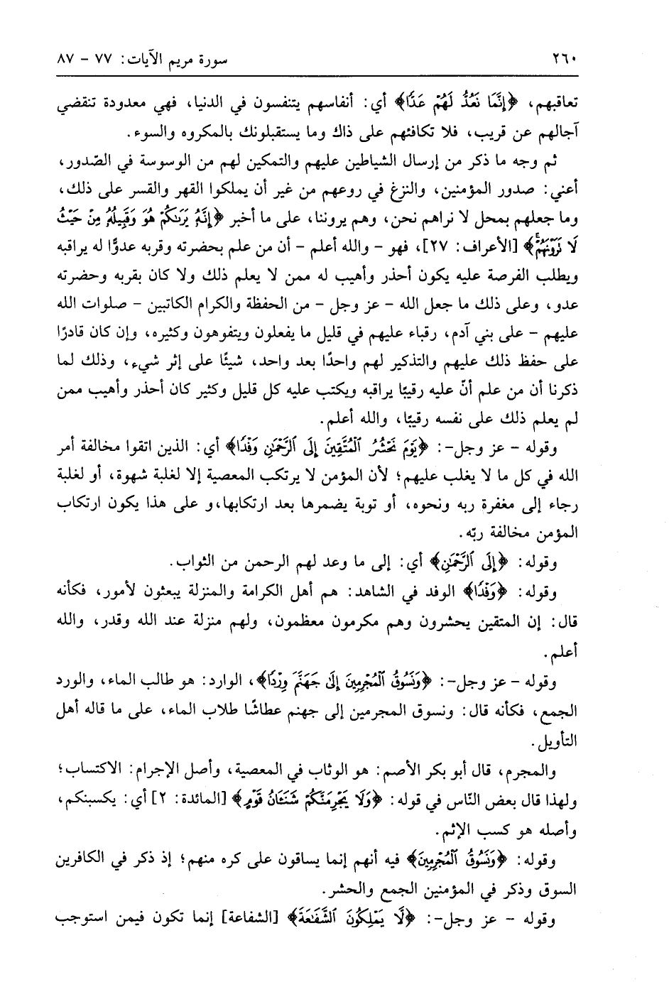 وقوله - عَزَّ وَجَلَّ -: (وَنَسُوقُ الْمُجْرِمِينَ إِلَى جَهَنَّمَ وِرْدًا (86) الوارد: هو طالب الماء، والورد الجمع، فكأنه قال: ونسوق المجرمين إلى جهنم عطاشًا طلاب الماء، على ما قاله أهل التأويل.