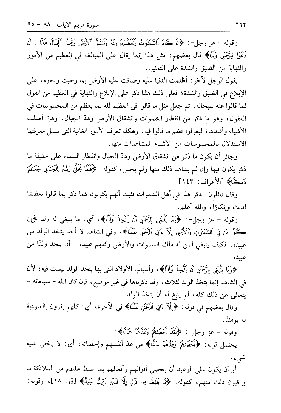 وقوله - عَزَّ وَجَلَّ -: (وَمَا يَنْبَغِي لِلرَّحْمَنِ أَنْ يَتَّخِذَ وَلَدًا (92) أي: ما ينبغي له ولد. (إِنْ كُلُّ مَنْ فِي السَّمَاوَاتِ وَالْأَرْضِ إِلَّا آتِي الرَّحْمَنِ عَبْدًا (93) وفي الشاهد لا أحد يتخذ الولد من عبيده، فكيف ينبغي لمن له ملك السماوات والأرض وكلهم عبيده - أن يتخذ ولدًا من عبيده.