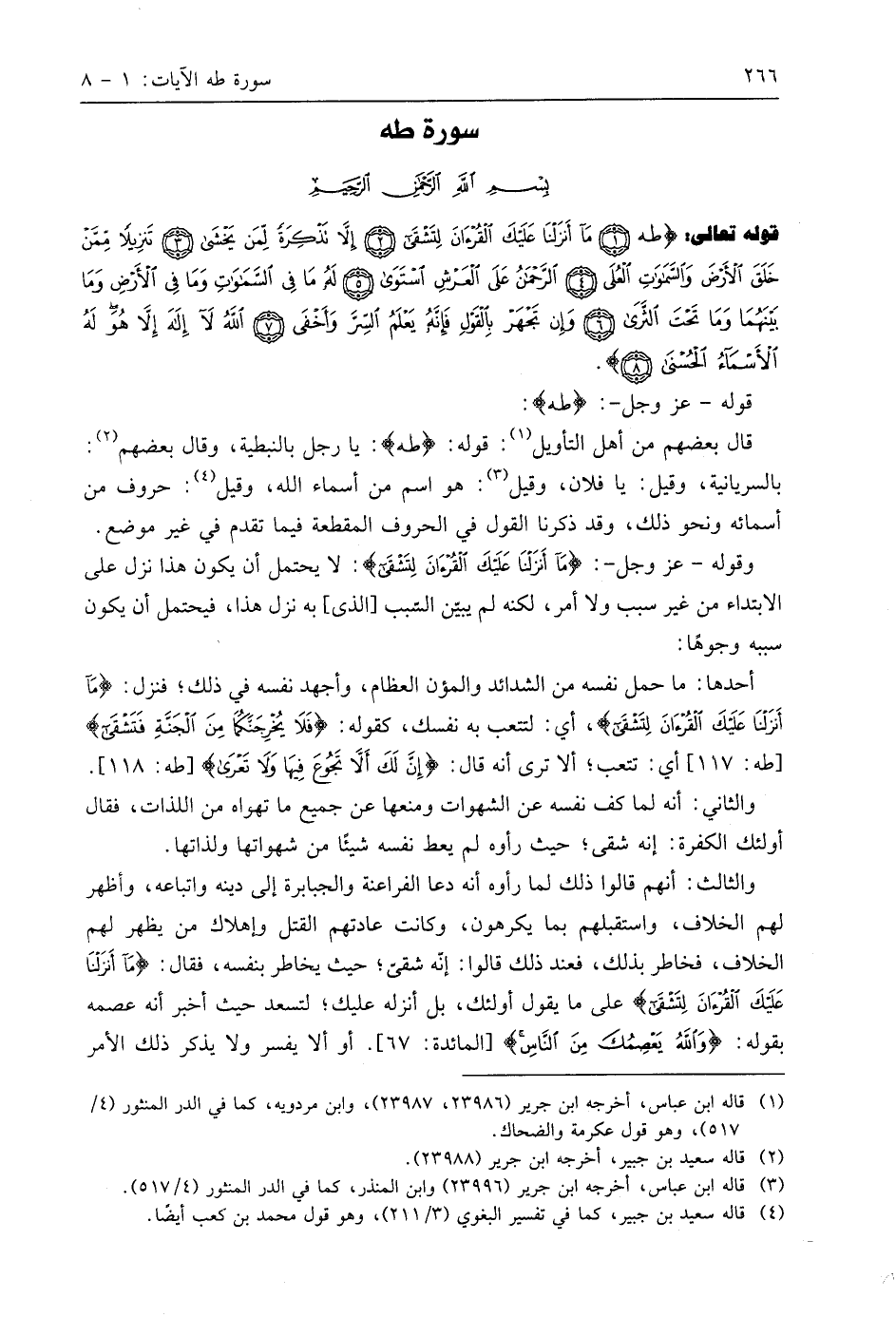 قوله تعالى: (طه (1) مَا أَنْزَلْنَا عَلَيْكَ الْقُرْآنَ لِتَشْقَى (2) إِلَّا تَذْكِرَةً لِمَنْ يَخْشَى (3) تَنْزِيلًا مِمَّنْ خَلَقَ الْأَرْضَ وَالسَّمَاوَاتِ الْعُلَى (4) الرَّحْمَنُ عَلَى الْعَرْشِ اسْتَوَى (5) لَهُ مَا فِي السَّمَاوَاتِ وَمَا فِي الْأَرْضِ وَمَا بَيْنَهُمَا وَمَا تَحْتَ الثَّرَى (6) وَإِنْ تَجْهَرْ بِالْقَوْلِ فَإِنَّهُ يَعْلَمُ السِّرَّ وَأَخْفَى (7) اللَّهُ لَا إِلَهَ إِلَّا هُوَ لَهُ الْأَسْمَاءُ الْحُسْنَى (8)