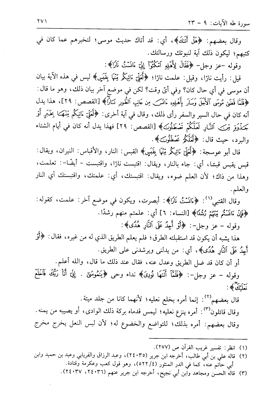 قيل: رأيت نارًا، وقيل: علمت نارًا؛ (لَعَلِّي آتِيكُمْ مِنْهَا بِقَبَسٍ) ليس في هذه الآية بيان أن موسى في أي حال كان؟ وفي أيّ وقت؟ لكن في موضع آخر بيان ذلك، وهو ما قال: (فَلَمَّا قَضَى مُوسَى الْأَجَلَ وَسَارَ بِأَهْلِهِ آنَسَ مِنْ جَانِبِ الطُّورِ نَارًا)، هذا يدل أنه كان في حال السير والسفر رأى ذلك، وقال في آية أخرى: (لَعَلِّي آتِيكُمْ مِنْهَا بِخَبَرٍ أَوْ جَذْوَةٍ مِنَ النَّارِ لَعَلَّكُمْ تَصْطَلُونَ)، فهذا يدل أنه كان في أيام الشتاء والبرد، حيث قال: (لَعَلَّكُمْ تَصْطَلُونَ).