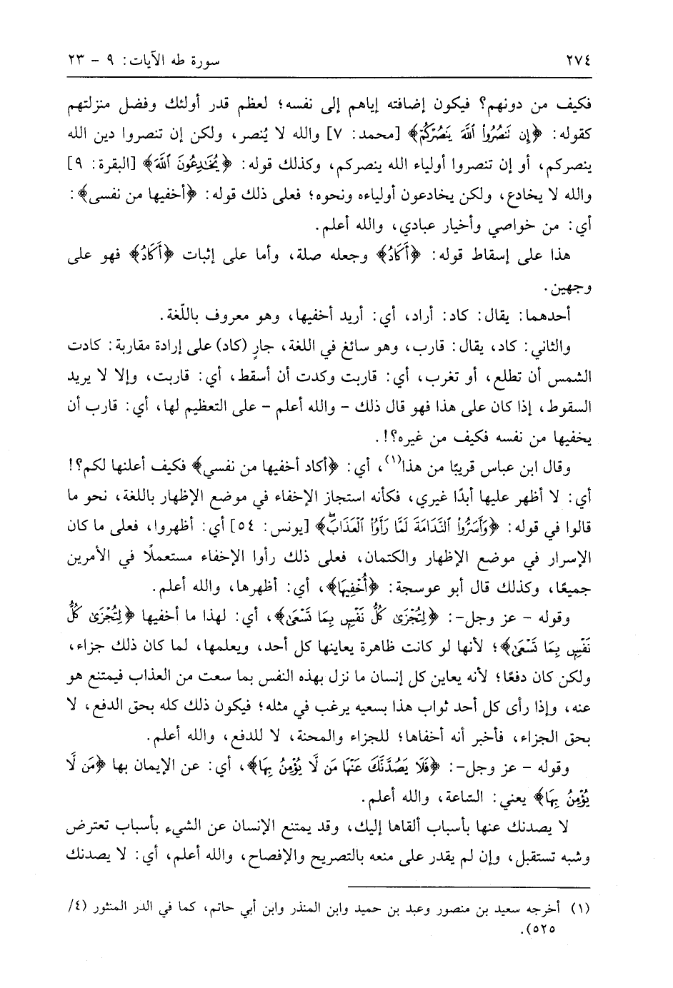 وقال ابن عَبَّاسٍ قريبًا من هذا، أي: (أكاد أخفيها من نفسي) فكيف أعلنها لكم؟! أي: لا أظهر عليها أبدًا غيري، فكأنه استجاز الإخفاء في موضع الإظهار باللغة، نحو ما قالوا في قوله: (وَأَسَرُّوا النَّدَامَةَ لَمَّا رَأَوُا الْعَذَابَ) أي: أظهروا، فعلى ما كان الإسرار في موضع الإظهار والكتمان، فعلى ذلك رأوا الإخفاء مستعملًا في الأمرين جميعًا، وكذلك قال أَبُو عَوْسَجَةَ: (أُخفِيهَا)، أي: أظهرها، واللَّه أعلم.