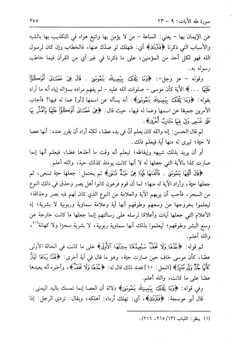 ثم قوله: (خُذْهَا وَلَا تَخَفْ سَنُعِيدُهَا سِيرَتَهَا الْأُولَى (21) على ما كانت في الحالة الأولى عصًا، كأن موسى خاف حين صارت حيّة، وهو ما قال في آية أخرى: (فَلَمَّا رَآهَا تَهْتَزُّ كَأَنَّهَا جَانٌّ وَلَّى مُدْبِرًا)، فعند ذلك قال له: (خُذْهَا وَلَا تَخَفْ)، وأخبره أنه يعيدها عصًا على ما كانت، واللَّه أعلم.