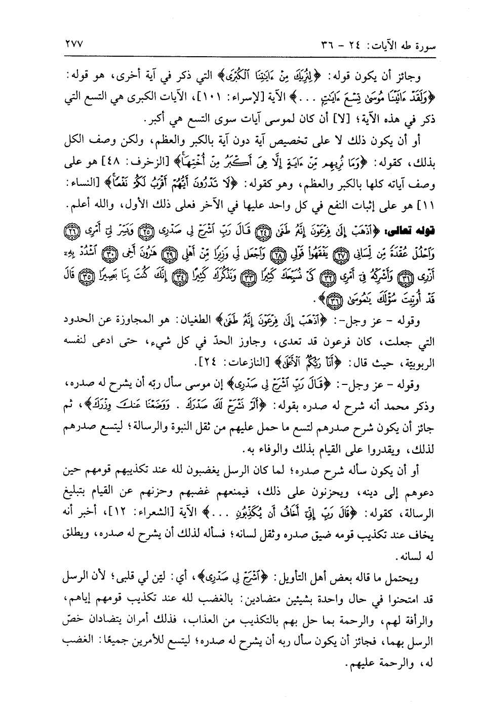 قوله تعالى: (اذْهَبْ إِلَى فِرْعَوْنَ إِنَّهُ طَغَى (24) قَالَ رَبِّ اشْرَحْ لِي صَدْرِي (25) وَيَسِّرْ لِي أَمْرِي (26) وَاحْلُلْ عُقْدَةً مِنْ لِسَانِي (27) يَفْقَهُوا قَوْلِي (28) وَاجْعَلْ لِي وَزِيرًا مِنْ أَهْلِي (29) هَارُونَ أَخِي (30) اشْدُدْ بِهِ أَزْرِي (31) وَأَشْرِكْهُ فِي أَمْرِي (32) كَيْ نُسَبِّحَكَ كَثِيرًا (33) وَنَذْكُرَكَ كَثِيرًا (34) إِنَّكَ كُنْتَ بِنَا بَصِيرًا (35) قَالَ قَدْ أُوتِيتَ سُؤْلَكَ يَا مُوسَى (36)