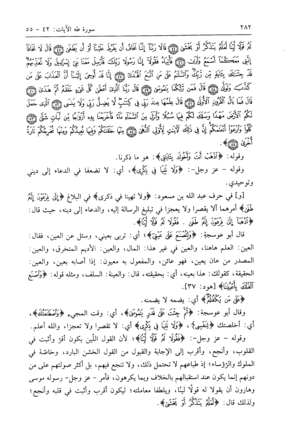 وحرف عبد اللَّه بن مسعود: (ولا تهينا في ذكري) وفي البلاغ (إِلَى فِرْعَوْنَ إِنَّهُ طَغَى (43) أمرهما ألا يقصرا ولا يعجزا في تبليغ الرسالة إليه، والدعاء إلى دينه، حيث قال: (اذْهَبَا إِلَى فِرْعَوْنَ إِنَّهُ طَغَى (43) فَقُولَا لَهُ قَوْلًا لَيِّنًا).