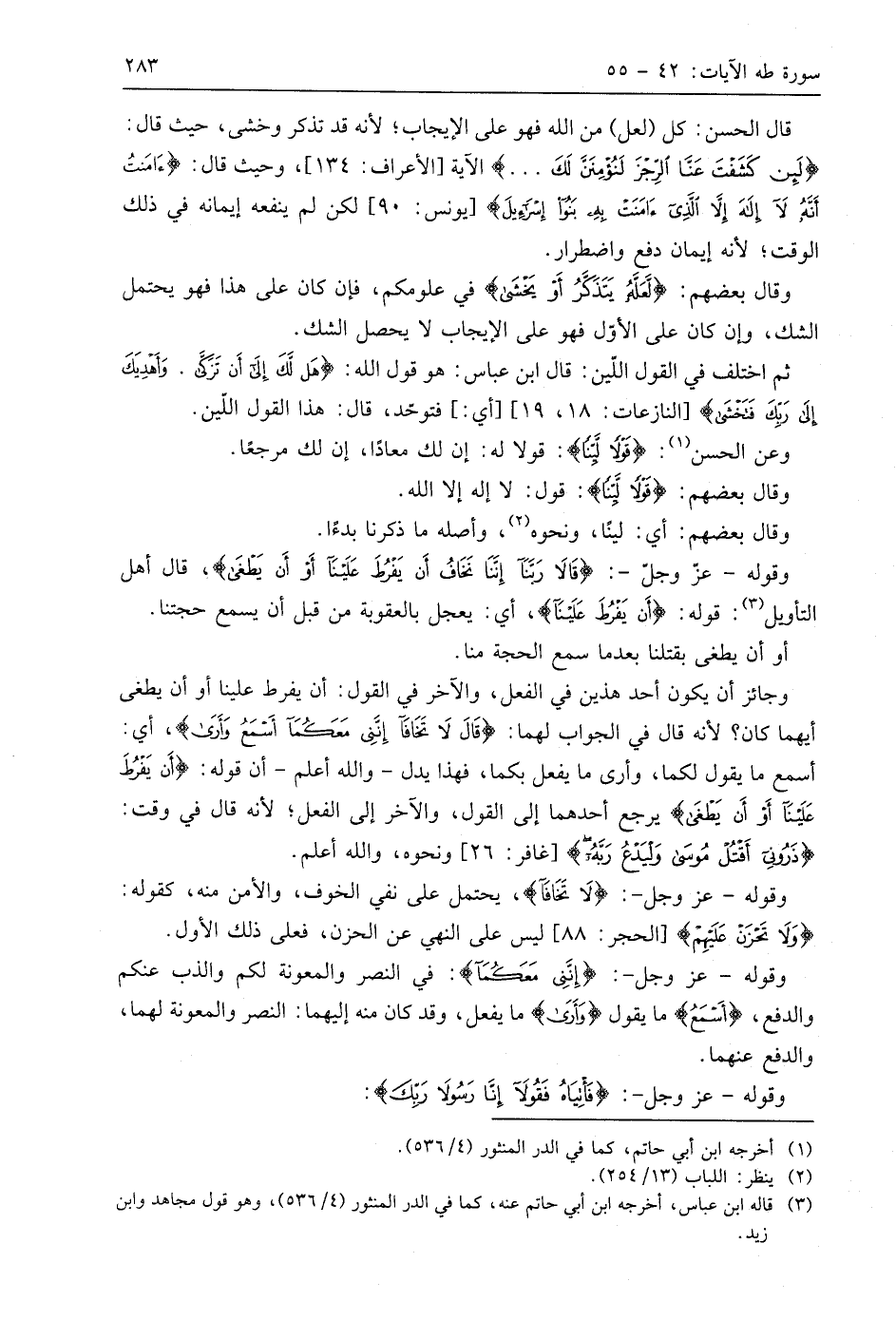 وجائز أن يكون أحد هذين في الفعل، والآخر في القول: أن يفرط علينا أو أن يطغى أيهما كان؟ لأنه قال في الجواب لهما: (قَالَ لَا تَخَافَا إِنَّنِي مَعَكُمَا أَسْمَعُ وَأَرَى)، أي: أسمع ما يقول لكما، وأرى ما يفعل بكما، فهذا يدل - واللَّه أعلم - أن قوله: (أَنْ يَفْرُطَ عَلَيْنَا أَوْ أَنْ يَطْغَى) يرجع أحدهما إلى القول، والآخر إلى الفعل؛ لأنه قال في وقت: (ذَرُونِي أَقْتُلْ مُوسَى وَلْيَدْعُ رَبَّهُ)، ونحوه، واللَّه أعلم.