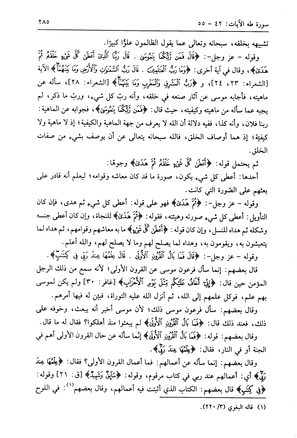 وقوله - عَزَّ وَجَلَّ -: (قَالَ فَمَنْ رَبُّكُمَا يَا مُوسَى (49) قَالَ رَبُّنَا الَّذِي أَعْطَى كُلَّ شَيْءٍ خَلْقَهُ ثُمَّ هَدَى (50) وقال في آية أخرى: (وَمَا رَبُّ الْعَالَمِينَ. قَالَ رَبُّ السَّمَاوَاتِ وَالْأَرْضِ وَمَا بَيْنَهُمَا) الآية، (رَبُّ الْمَشْرِقِ وَالْمَغْرِبِ وَمَا بَيْنَهُمَا)، سأله عن ماهيته، فأجابه موسى عن آثار صنعه في خلقه، وأنه ربُّ كل شيء، وربُّ ما ذكر، لم يجبه عما سأله من ماهيته وكيفيته، حيث قال: (فَمَنْ رَبُّكُمَا يَا مُوسَى)، فجوابه عن الماهية: ربنا فلان، وأنه كذا، ففيه دلالة أن اللَّه لا يعرف من جهة الماهية والكيفية؛ إذ لا ماهية ولا كيفية؛ إذ هما أوصاف الخلق، فاللَّه سبحانه يتعالى عن أن يوصف بشيء من صفات الخلق.
