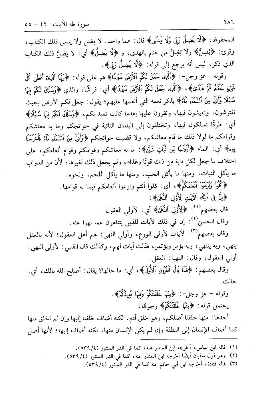 وقوله - عَزَّ وَجَلَّ -. (الَّذِي جَعَلَ لَكُمُ الْأَرْضَ مَهْدًا ... (53) هو على قوله: (رَبُّنَا الَّذِي أَعْطَى كُلَّ شَيْءٍ خَلْقَهُ ثُمَّ هَدَى)، (الَّذِي جَعَلَ لَكُمُ الْأَرْضَ مَهْدًا) أي: فراشًا، والذي (سَلَكَ لَكُمْ فِيهَا سُبُلًا وَأَنْزَلَ مِنَ السَّمَاءِ مَاءً) يذكر نعمه التي أنعمها عليهم؛ يقول: جعل لكم الأرض بحيث تفترشون، وتعيشون فيها، وتقرون عليها بعدما كانت تميد بكم، (وَسَلَكَ لَكُمْ فِيهَا سُبُلًا) أي: طرقًا تسلكون فيها، وتختلفون إلى البلدان النائية في حوائجكم وما به معاشكم وقوامكم ما لولا ذلك ما قام معاشكم، ولا قضيت حوائجكم (وَأَنْزَلَ مِنَ السَّمَاءِ مَاءً فَأَخْرَجْنَا بِهِ) أي: الماء (أَزْوَاجًا مِنْ نَبَاتٍ شَتَّى): ما به معاشكم وقوامكم وقوام أنعامكم، على اختلاف ما جعل لكل دابة من ذلك قوتًا وغذاء، ولم يجعل ذلك لغيرها؛ لأن من الدواب ما يأكل النبات، ومنها ما يأكل الحب، ومنها ما يأكل اللحم، ونحوه.