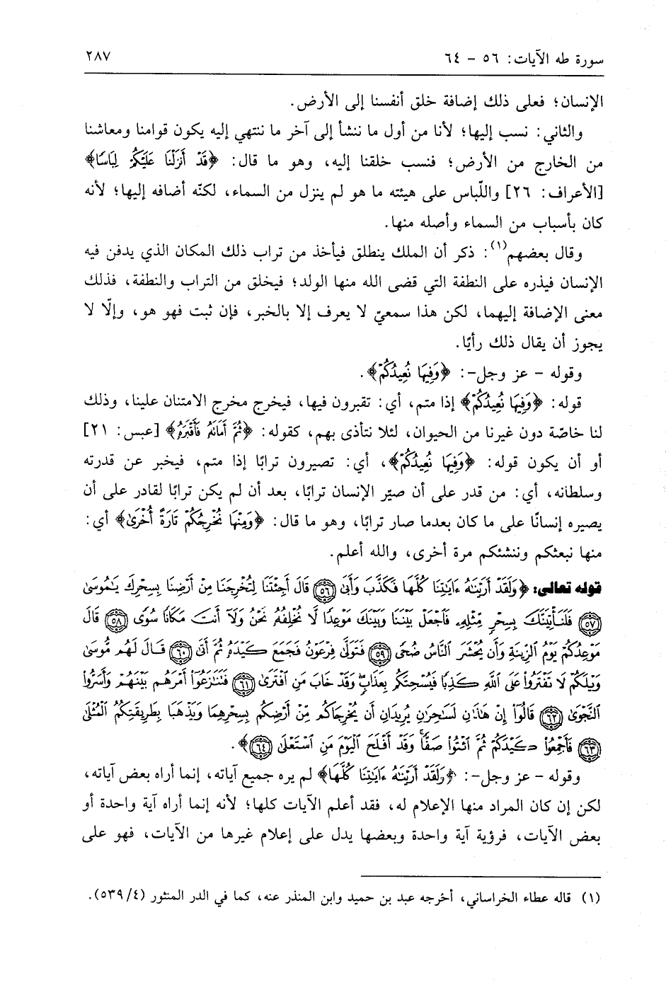 قوله: (وَفِيهَا نُعِيدُكُمْ) إذا متم، أي: تقبرون فيها، فيخرج مخرج الامتنان علينا، وذلك لنا خاصة دون غيرنا من الحيوان، لئلا نتأذى بهم، كقوله: (ثُمَّ أَمَاتَهُ فَأَقْبَرَهُ)، أو أن يكون قوله: (وَفِيهَا نُعِيدُكُمْ)، أي: تصيرون ترابًا إذا متم، فيخبر عن قدرته وسلطانه، أي: من قدر على أن صيَّر الإنسان ترابًا، بعد أن لم يكن ترابًا لقادر على أن يصيره إنسانًا على ما كان بعدما صار ترابًا، وهو ما قال: (وَمِنْهَا نُخْرِجُكُمْ تَارَةً أُخْرَى) أي: منها نبعثكم وننشئكم مرة أخرى، واللَّه أعلم.