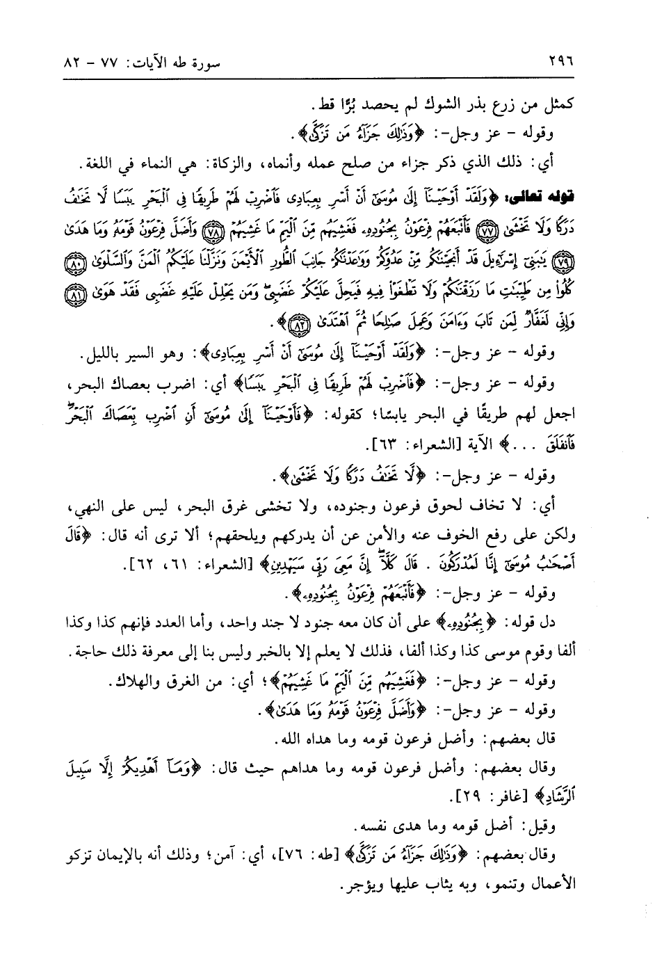 قوله تعالى: (وَلَقَدْ أَوْحَيْنَا إِلَى مُوسَى أَنْ أَسْرِ بِعِبَادِي فَاضْرِبْ لَهُمْ طَرِيقًا فِي الْبَحْرِ يَبَسًا لَا تَخَافُ دَرَكًا وَلَا تَخْشَى (77) فَأَتْبَعَهُمْ فِرْعَوْنُ بِجُنُودِهِ فَغَشِيَهُمْ مِنَ الْيَمِّ مَا غَشِيَهُمْ (78) وَأَضَلَّ فِرْعَوْنُ قَوْمَهُ وَمَا هَدَى (79) يَا بَنِي إِسْرَائِيلَ قَدْ أَنْجَيْنَاكُمْ مِنْ عَدُوِّكُمْ وَوَاعَدْنَاكُمْ جَانِبَ الطُّورِ الْأَيْمَنَ وَنَزَّلْنَا عَلَيْكُمُ الْمَنَّ وَالسَّلْوَى (80) كُلُوا مِنْ طَيِّبَاتِ مَا رَزَقْنَاكُمْ وَلَا تَطْغَوْا فِيهِ فَيَحِلَّ عَلَيْكُمْ غَضَبِي وَمَنْ يَحْلِلْ عَلَيْهِ غَضَبِي فَقَدْ هَوَى (81) وَإِنِّي لَغَفَّارٌ لِمَنْ تَابَ وَآمَنَ وَعَمِلَ صَالِحًا ثُمَّ اهْتَدَى (82)
