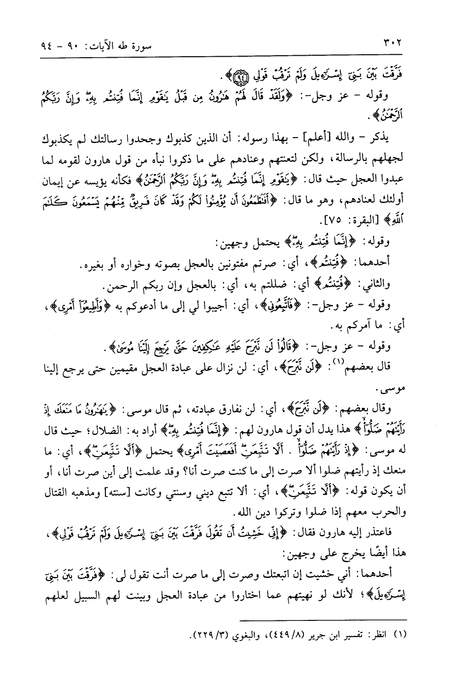 هذا يدل أن قول هارون لهم: (إِنَّمَا فُتِنْتُمْ بِهِ) أراد به: الضلال؛ حيث قال له موسى: (إِذْ رَأَيْتَهُمْ ضَلُّوا (92) أَلَّا تَتَّبِعَنِ أَفَعَصَيْتَ أَمْرِي (93) يحتمل (أَلَّا تَتَّبِعَنِ)، أي: ما منعك إذ رأيتهم ضلوا ألا صرت إلى ما كنت صرت أنا؟ وقد علمت إلى أين صرت أنا، أو أن يكون قوله: (أَلَّا تَتَّبِعَنِ)، أي: ألا تتبع ديني وسنتي وكانت سنته ومذهبه القتال والحرب معهم إذا ضلوا وتركوا دين اللَّه.