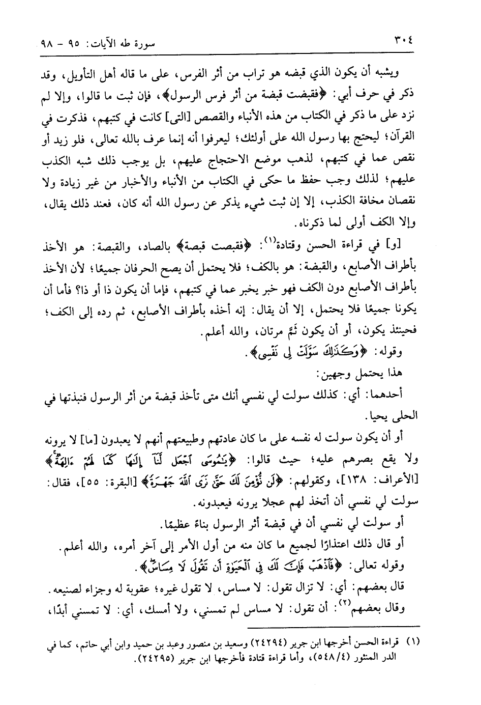 ويشبه أن يكون الذي قبضه هو تراب من أثر الفرس، على ما قاله أهل التأويل، وقد ذكر في حرف أبي: (فقبضت قبضة من أثر فرس الرسول)، فإن ثبت ما قالوا، وإلا لم نزد على ما ذكر في الكتاب من هذه الأنباء والقصص التي كانت في كتبهم، فذكرت في القرآن؛ ليحتج بها رسول اللَّه على أُولَئِكَ؛ ليعرفوا أنه إنما عرف باللَّه تعالى، فلو زيد أو نقص عما في كتبهم، لذهب موضع الاحتجاج عليهم، بل يوجب ذلك شبه الكذب عليهم؛ لذلك وجب حفظ ما حكى في الكتاب من الأنباء والأخبار من غير زيادة ولا نقصان مخافة الكذب، إلا إن ثبت شيء يذكر عن رسول اللَّه أنه كان، فعند ذلك يقال، وإلا الكف أولى لما ذكرناه.