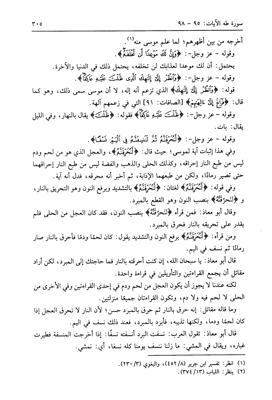 وفي هذا إثبات آية لموسى؛ حيث قال: (لَنُحَرِّقَنَّهُ)، والعجل الذي هو من لحم ودم ليس من طبع النار إحراقه، وكذلك الحلي والذهب والفضة ليس من طبع النار إحراقهما حتى تصير رمادًا، ولكن من طبعهما الإذابة، ثم أخبر أنه محرقه، فدل أنه آية.