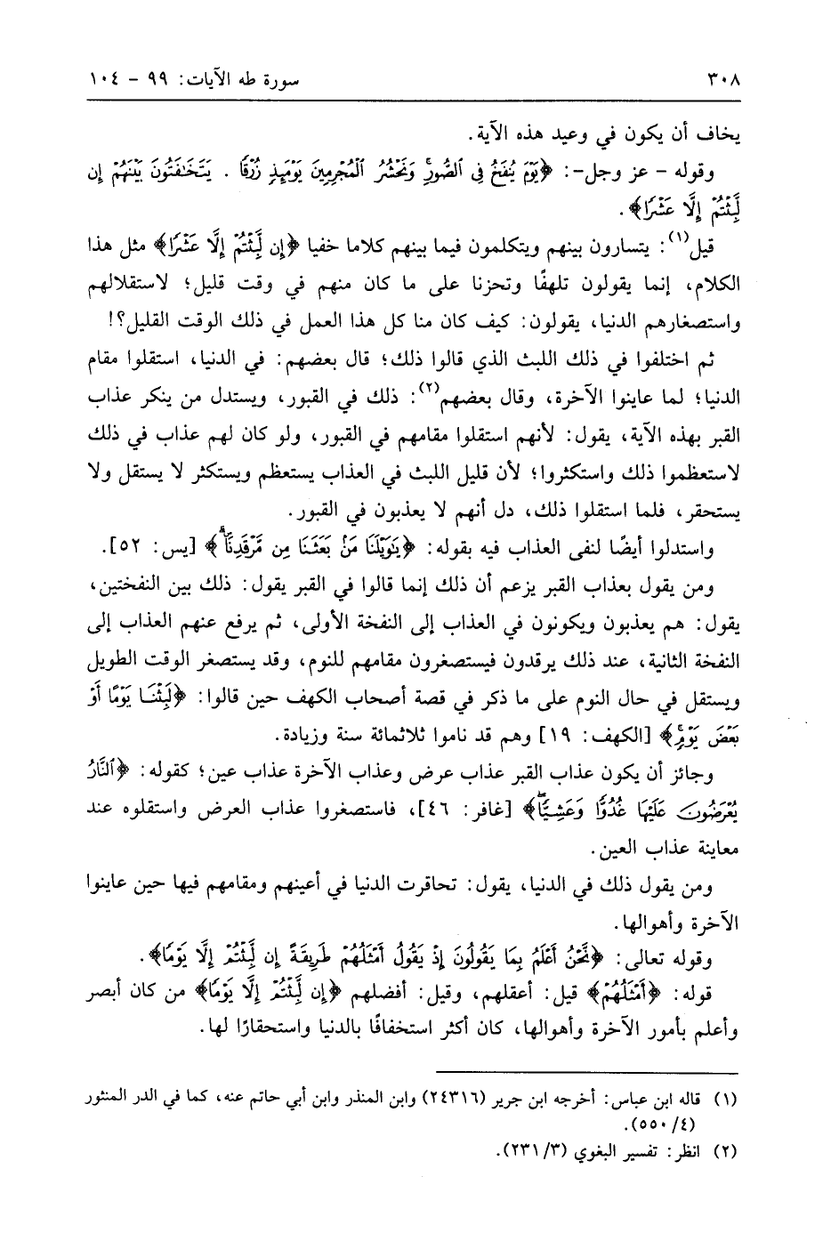 وقوله - عَزَّ وَجَلَّ -: (يَوْمَ يُنْفَخُ فِي الصُّورِ وَنَحْشُرُ الْمُجْرِمِينَ يَوْمَئِذٍ زُرْقًا (102) يَتَخَافَتُونَ بَيْنَهُمْ إِنْ لَبِثْتُمْ إِلَّا عَشْرًا (103)