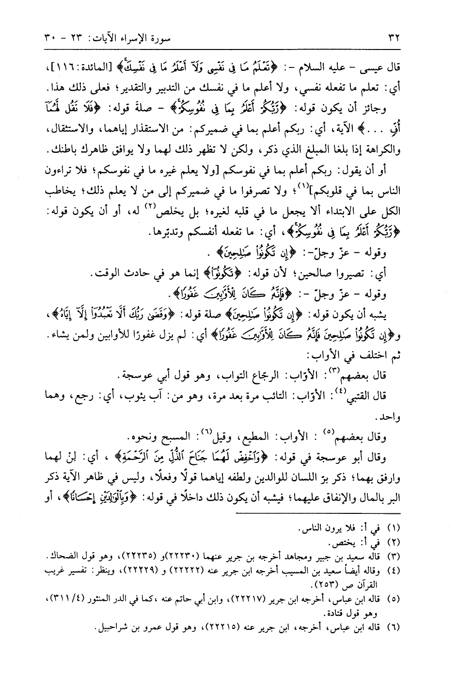 وجائز أن يكون قوله: (رَبُّكُمْ أَعْلَمُ بِمَا فِي نُفُوسِكُمْ) - صلةَ قوله: (فَلَا تَقُلْ لَهُمَا أُفٍّ. . .) الآية، أي: ربكم أعلم بما في ضميركم: من الاستقذار إياهما، والاستثقال، والكراهة إذا بلغا المبلغ الذي ذكر، ولكن لا تظهر ذلك لهما ولا يوافق ظاهرك باطنك. أو أن يقول: ربكم أعلم بما في نفوسكم أولا يعلم غيره ما في نفوسكم؛ فلا تراءون الناس بما في قلوبكم؛ ولا تصرفوا ما في ضميركم إلى من لا يعلم ذلك؛ يخاطب الكل على الابتداء ألا يجعل ما في قلبه لغيره؛ بل يخلص له، أو أن يكون قوله: أي: ما تفعله أنفسكم وتدبّرها.