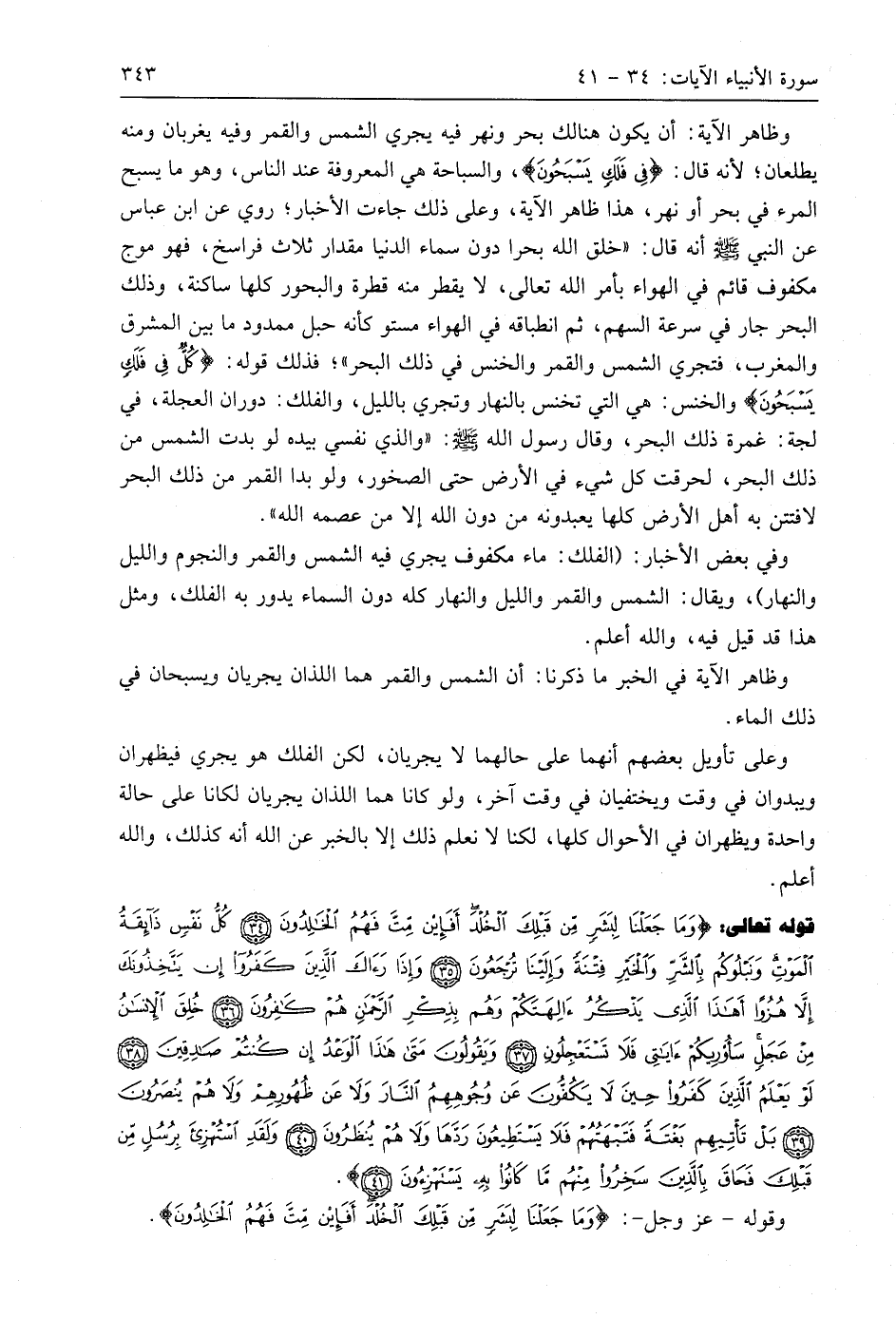 وظاهر الآية: أن يكون هنالك بحر ونهر فيه يجري الشمس والقمر وفيه يغربان ومنه يطلعان؛ لأنه قال: (فِي فَلَكٍ يَسْبَحُونَ)، والسباحة هي المعروفة عند الناس، وهو ما يسبح المرء في بحر أو نهر، هذا ظاهر الآية، وعلى ذلك جاءت الأخبار؛ روي عن ابن عَبَّاسٍ عن النبي - صَلَّى اللَّهُ عَلَيهِ وَسَلَّمَ - أنه قال: " خلق اللَّه بحرا دون سماء الدنيا مقدار ثلاث فراسخ، فهو موج مكفوف قائم في الهواء بأمر اللَّه تعالى، لا يقطر منه قطرة والبحور كلها ساكنة، وذلك البحر جار في سرعة السهم، ثم انطباقه في الهواء مستو كأنه حبل ممدود ما بين المشرق والمغرب، فتجري الشمس والقمر والخنس في ذلك البحر "؛ فذلك قوله: (كُلٌّ فِي فَلَكٍ يَسْبَحُونَ) والخنس: هي التي تخنس بالنهار وتجري بالليل، والفلك: دوران العجلة، في لجة: غمرة ذلك البحر، وقال رسول اللَّه - صَلَّى اللَّهُ عَلَيهِ وَسَلَّمَ -: " والذي نفسي بيده لو بدت الشمس من ذلك البحر، لحرقت كل شيء في الأرض حتى الصخور، ولو بدا القمر من ذلك البحر لافتتن به أهل الأرض كلها يعبدونه من دون اللَّه إلا من عصمه اللَّه ".