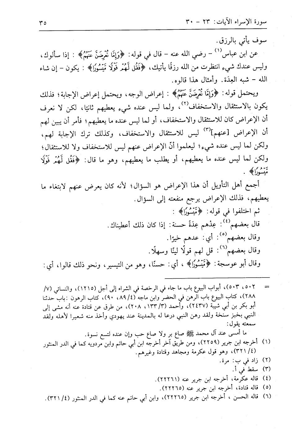 عن ابن عَبَّاسٍ - رَضِيَ اللَّهُ عَنْهُ - قال في قوله: (وَإِمَّا تُعْرِضَنَّ عَنْهُمُ): إذا سألوك، وليس عندك شيء انتظرت من اللَّه رزقًا يأتيك، (فَقُلْ لَهُمْ قَوْلًا مَيْسُورًا): يكون - إن شاء اللَّه - شبه العِدَة. وأمثال هذا قالوه.