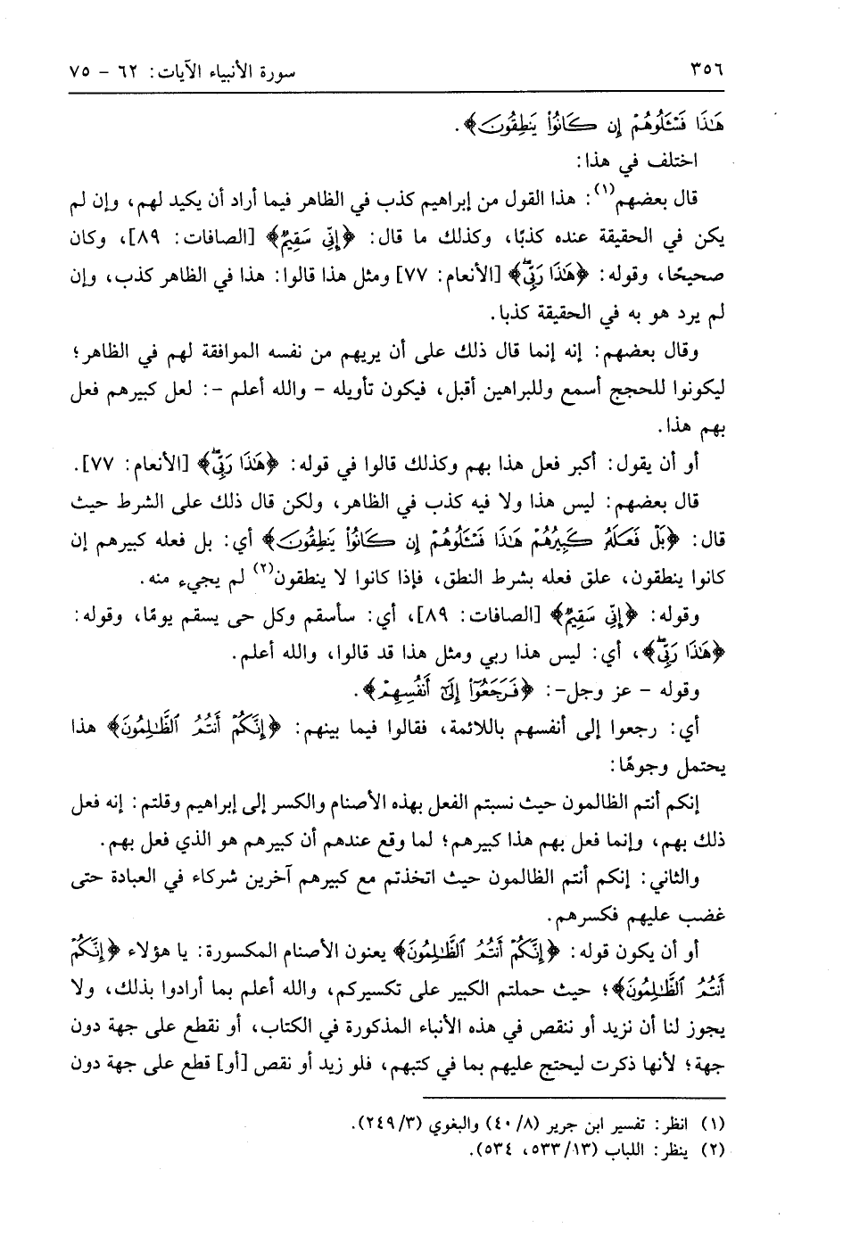 أو أن يكون قوله: (إِنَّكُمْ أَنْتُمُ الظَّالِمُونَ) يعنون الأصنام المكسورة: يا هَؤُلَاءِ (إِنَّكُمْ أَنْتُمُ الظَّالِمُونَ)؛ حيث حملتم الكبير على تكسيركم، واللَّه أعلم بما أرادوا بذلك، ولا يجوز لنا أن نزيد أو ننقص في هذه الأنباء المذكورة في الكتاب، أو نقطع على جهة دون جهة؛ لأنها ذكرت ليحتج عليهم بما في كتبهم، فلو زيد أو نقص أو قطع على جهة دون