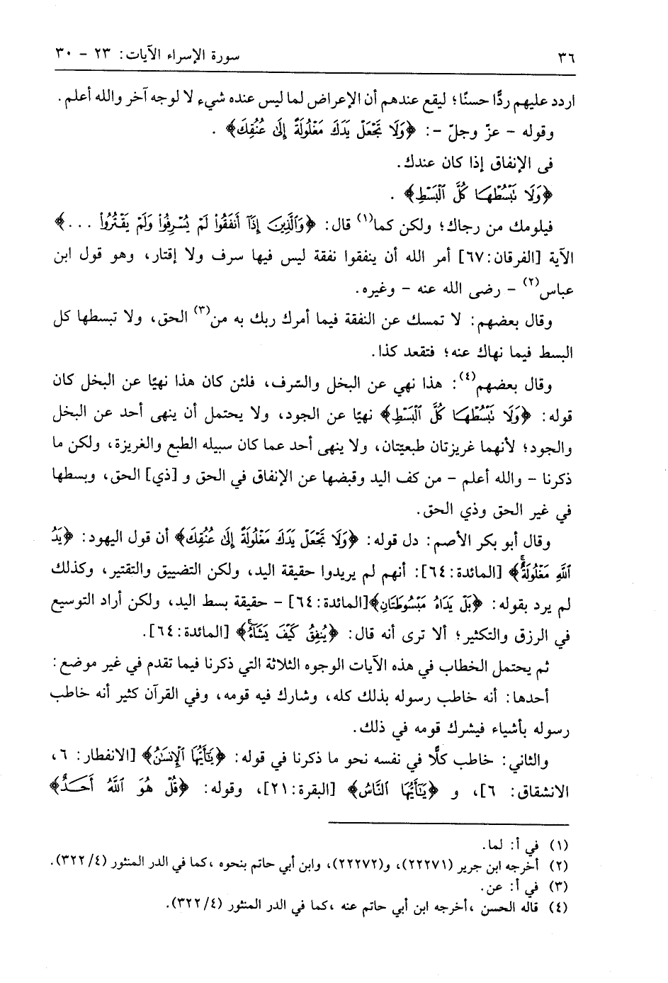 وقوله - عَزَّ وَجَلَّ -: (وَلَا تَجْعَلْ يَدَكَ مَغْلُولَةً إِلَى عُنُقِكَ وَلَا تَبْسُطْهَا كُلَّ الْبَسْطِ فَتَقْعُدَ مَلُومًا مَحْسُورًا (29)