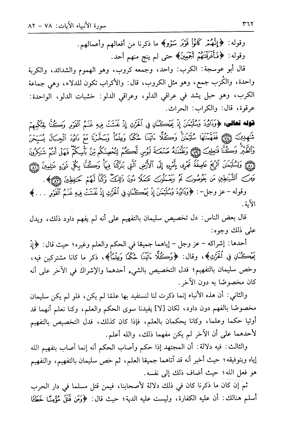قوله تعالى: (وَدَاوُودَ وَسُلَيْمَانَ إِذْ يَحْكُمَانِ فِي الْحَرْثِ إِذْ نَفَشَتْ فِيهِ غَنَمُ الْقَوْمِ وَكُنَّا لِحُكْمِهِمْ شَاهِدِينَ (78) فَفَهَّمْنَاهَا سُلَيْمَانَ وَكُلًّا آتَيْنَا حُكْمًا وَعِلْمًا وَسَخَّرْنَا مَعَ دَاوُودَ الْجِبَالَ يُسَبِّحْنَ وَالطَّيْرَ وَكُنَّا فَاعِلِينَ (79) وَعَلَّمْنَاهُ صَنْعَةَ لَبُوسٍ لَكُمْ لِتُحْصِنَكُمْ مِنْ بَأْسِكُمْ فَهَلْ أَنْتُمْ شَاكِرُونَ (80) وَلِسُلَيْمَانَ الرِّيحَ عَاصِفَةً تَجْرِي بِأَمْرِهِ إِلَى الْأَرْضِ الَّتِي بَارَكْنَا فِيهَا وَكُنَّا بِكُلِّ شَيْءٍ عَالِمِينَ (81) وَمِنَ الشَّيَاطِينِ مَنْ يَغُوصُونَ لَهُ وَيَعْمَلُونَ عَمَلًا دُونَ ذَلِكَ وَكُنَّا لَهُمْ حَافِظِينَ (82)