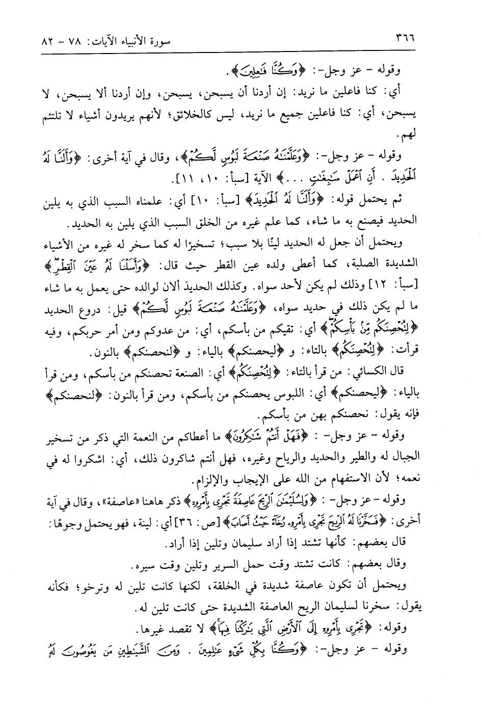 وقوله - عَزَّ وَجَلَّ -: (وَعَلَّمْنَاهُ صَنْعَةَ لَبُوسٍ لَكُمْ ... (80) وقال في آية أخرى: (وَأَلَنَّا لَهُ الْحَدِيدَ (10) أَنِ اعْمَلْ سَابِغَاتٍ. . .) الآية.