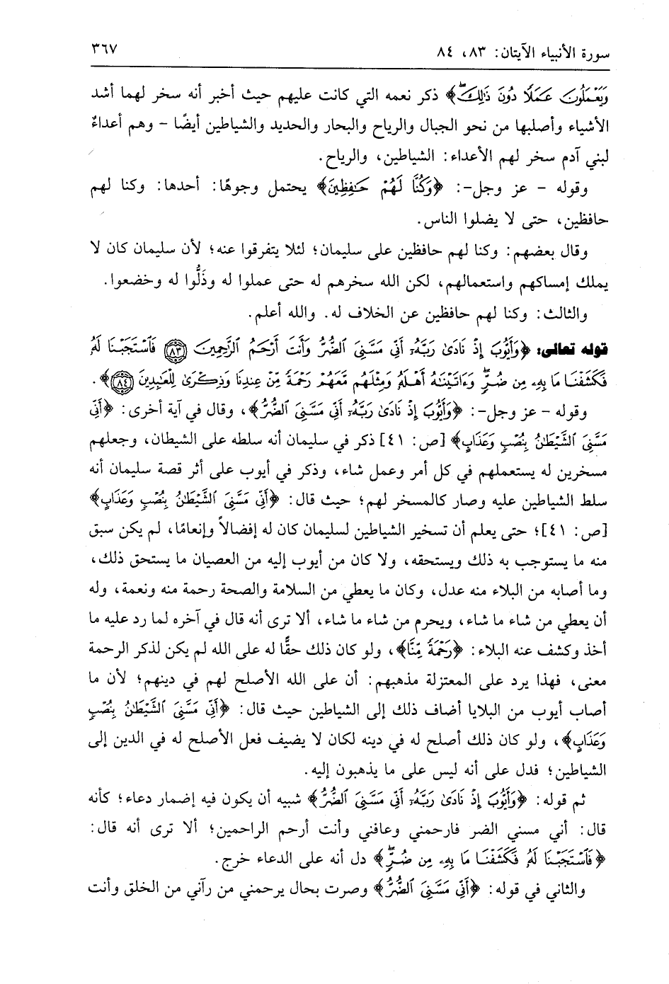 ثم قوله: (وَأَيُّوبَ إِذْ نَادَى رَبَّهُ أَنِّي مَسَّنِيَ الضُّرُّ) شبيه أن يكون فيه إضمار دعاء؛ كأنه قال: أني مسني الضر فارحمني وعافني وأنت أرحم الراحمين؛ ألا ترى أنه قال: (فَاسْتَجَبْنَا لَهُ فَكَشَفْنَا مَا بِهِ مِنْ ضُرٍّ) دل أنه على الدعاء خرج.