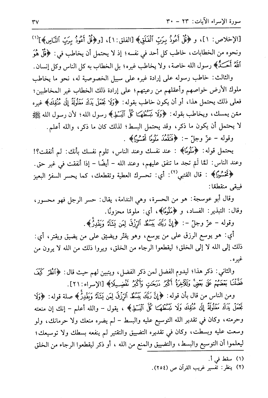 والثالث: خاطب رسوله على إرادة غيره على سبيل الخصوصية له، نحو ما يخاطب ملوك الأرض خواصهم وأعقلهم من رعيتهم؛ على إرادة ذلك الخطاب غير المخاطبين؛ فعلى ذلك يحتمل هذا، أو أن يكون خاطب بقوله: (وَلَا تَجْعَلْ يَدَكَ مَغْلُولَةً إِلَى عُنُقِكَ) غيره ممن يمسك، ويخاطب بقوله: (وَلَا تَبْسُطْهَا كُلَّ الْبَسْطِ) رسول اللَّه؛ لأن رسول اللَّه - صَلَّى اللَّهُ عَلَيهِ وَسَلَّمَ - لا يحتمل أن يكون ما ذكر، وقد يحتمل البسط؛ لذلك كان ما ذكر، واللَّه أعلم.