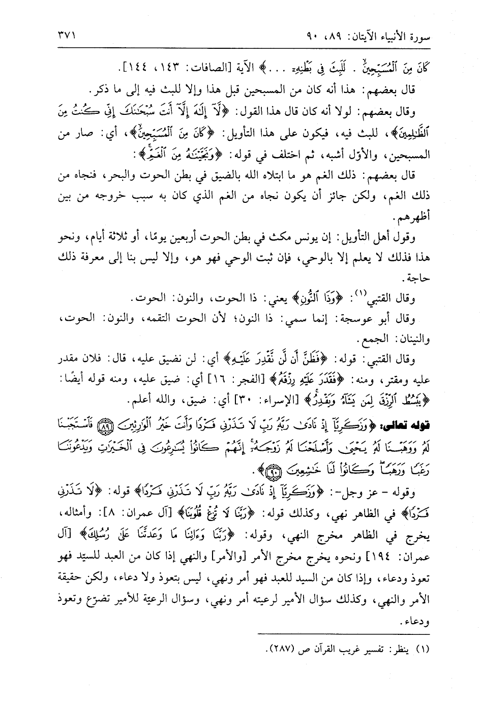 وقوله - عَزَّ وَجَلَّ -: (وَزَكَرِيَّا إِذْ نَادَى رَبَّهُ رَبِّ لَا تَذَرْنِي فَرْدًا) قوله: (لَا تَذَرْنِي فَرْدًا) في الظاهر نهي، وكذلك قوله: (رَبَّنَا لَا تُزِغْ قُلُوبَنَا): وأمثاله، يخرج في الظاهر مخرج النهي، وقوله: (رَبَّنَا وَآتِنَا مَا وَعَدْتَنَا عَلَى رُسُلِكَ) ونحوه يخرج مخرج الأمر أوالأمر، والنهي إذا كان من العبد للسيد فهو تعوذ ودعاء، وإذا كان من السيد للعبد فهو أمر ونهي، ليس بتعوذ ولا دعاء، ولكن حقيقة الأمر والنهي، وكذلك سؤال الأمير لرعيته أمر ونهي، وسؤال الرعيّة للأمير تضرّع وتعوذ ودعاء.