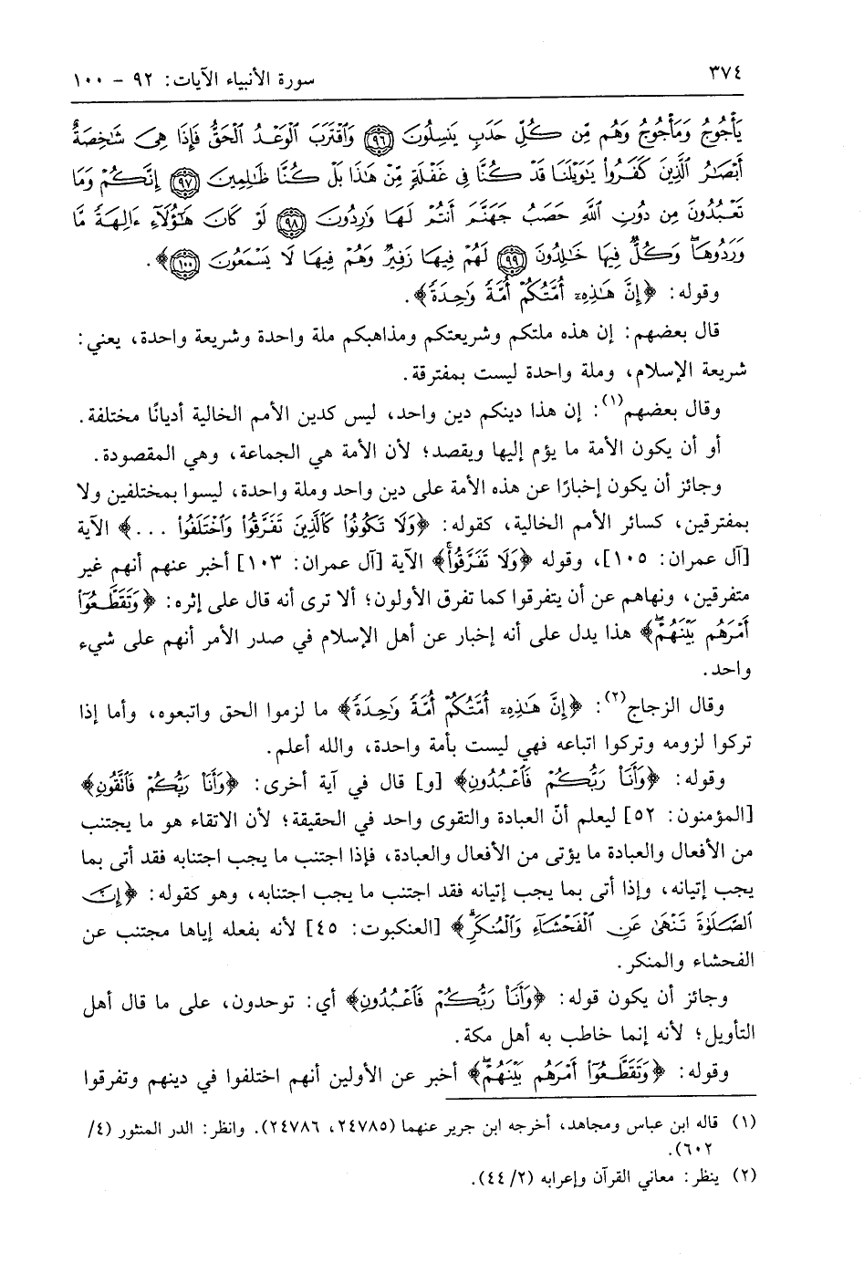 وقوله: (إِنَّ هَذِهِ أُمَّتُكُمْ أُمَّةً وَاحِدَةً وَأَنَا رَبُّكُمْ فَاعْبُدُونِ (92)