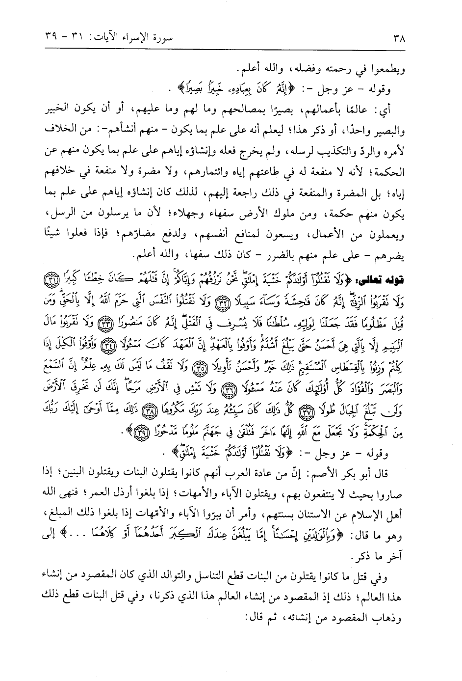 قوله تعالى: (وَلَا تَقْتُلُوا أَوْلَادَكُمْ خَشْيَةَ إِمْلَاقٍ نَحْنُ نَرْزُقُهُمْ وَإِيَّاكُمْ إِنَّ قَتْلَهُمْ كَانَ خِطْئًا كَبِيرًا (31) وَلَا تَقْرَبُوا الزِّنَا إِنَّهُ كَانَ فَاحِشَةً وَسَاءَ سَبِيلًا (32) وَلَا تَقْتُلُوا النَّفْسَ الَّتِي حَرَّمَ اللَّهُ إِلَّا بِالْحَقِّ وَمَنْ قُتِلَ مَظْلُومًا فَقَدْ جَعَلْنَا لِوَلِيِّهِ سُلْطَانًا فَلَا يُسْرِفْ فِي الْقَتْلِ إِنَّهُ كَانَ مَنْصُورًا (33) وَلَا تَقْرَبُوا مَالَ الْيَتِيمِ إِلَّا بِالَّتِي هِيَ أَحْسَنُ حَتَّى يَبْلُغَ أَشُدَّهُ وَأَوْفُوا بِالْعَهْدِ إِنَّ الْعَهْدَ كَانَ مَسْئُولًا (34) وَأَوْفُوا الْكَيْلَ إِذَا كِلْتُمْ وَزِنُوا بِالْقِسْطَاسِ الْمُسْتَقِيمِ ذَلِكَ خَيْرٌ وَأَحْسَنُ تَأْوِيلًا (35) وَلَا تَقْفُ مَا لَيْسَ لَكَ بِهِ عِلْمٌ إِنَّ السَّمْعَ وَالْبَصَرَ وَالْفُؤَادَ كُلُّ أُولَئِكَ كَانَ عَنْهُ مَسْئُولًا (36) وَلَا تَمْشِ فِي الْأَرْضِ مَرَحًا إِنَّكَ لَنْ تَخْرِقَ الْأَرْضَ وَلَنْ تَبْلُغَ الْجِبَالَ طُولًا (37) كُلُّ ذَلِكَ كَانَ سَيِّئُهُ عِنْدَ رَبِّكَ مَكْرُوهًا (38) ذَلِكَ مِمَّا أَوْحَى إِلَيْكَ رَبُّكَ مِنَ الْحِكْمَةِ وَلَا تَجْعَلْ مَعَ اللَّهِ إِلَهًا آخَرَ فَتُلْقَى فِي جَهَنَّمَ مَلُومًا مَدْحُورًا (39)