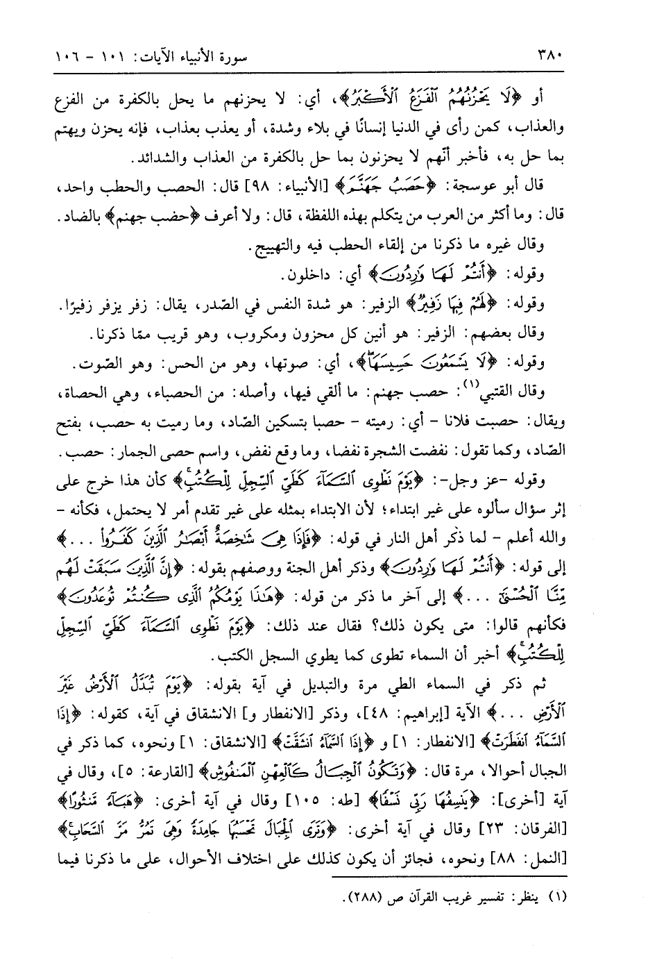 وقوله - عَزَّ وَجَلَّ -: (يَوْمَ نَطْوِي السَّمَاءَ كَطَيِّ السِّجِلِّ لِلْكُتُبِ كَمَا بَدَأْنَا أَوَّلَ خَلْقٍ نُعِيدُهُ وَعْدًا عَلَيْنَا إِنَّا كُنَّا فَاعِلِينَ (104) كأن هذا خرج على إثر سؤال سألوه على غير ابتداء؛ لأن الابتداء بمثله على غير تقدم أمر لا يحتمل، فكأنه - واللَّه أعلم - لما ذكر أهل النار في قوله: (فَإِذَا هِيَ شَاخِصَةٌ أَبْصَارُ الَّذِينَ كَفَرُوا. . .) إلى قوله: (أَنْتُمْ لَهَا وَارِدُونَ) وذكر أهل الجنة ووصفهم بقوله: (إِنَّ الَّذِينَ سَبَقَتْ لَهُمْ مِنَّا الْحُسْنَى. . .) إلى آخر ما ذكر من قوله: (هَذَا يَوْمُكُمُ الَّذِي كُنْتُمْ تُوعَدُونَ) فكأنهم قالوا: متى يكون ذلك؟ فقال عند ذلك: (يَوْمَ نَطْوِي السَّمَاءَ كَطَيِّ السِّجِلِّ لِلْكُتُبِ) أخبر أن السماء تطوى كما يطوي السجل الكتب.