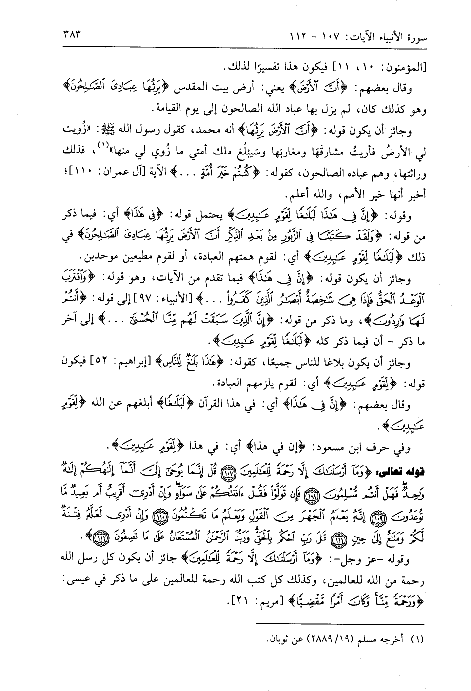 وجائز أن يكون قوله: (أَنَّ الْأَرْضَ يَرِثُهَا) [أمَّة محمد]، كقول رسول اللَّه - صَلَّى اللَّهُ عَلَيهِ وَسَلَّمَ -: " زُويت لي الأرضُ فأريتُ مشارقَهَا ومغاربَها وسَيبلُغ ملك أمتي ما زُوي لي منها "، فذلك وراثتها، وهم عباده الصالحون، كقوله: (كُنْتُمْ خَيْرَ أُمَّةٍ. . .) الآية؛ أخبر أنها خير الأمم، واللَّه أعلم.