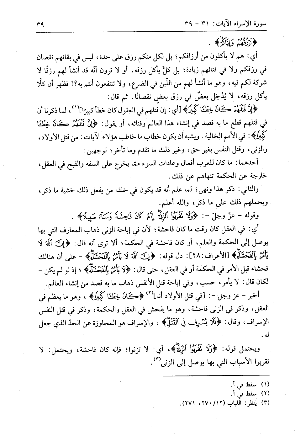 أخبر - عَزَّ وَجَلَّ -: في قتل الأولاد أنه، (كَانَ خِطْئًا كَبِيرًا)، وهو ما يعظم في العقل، وذكر في الزنى فاحشة، وهو ما يفحش في العقل والحكمة، وذكر في قتل النفس الإسراف، وقال: (فَلَا يُسْرِفْ فِي الْقَتْلِ)، والإسراف هو المجاوزة عن الحد الذي جعل له.
