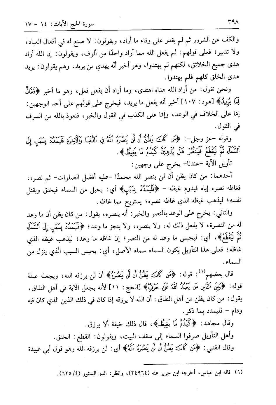 وقَالَ الْقُتَبِيُّ: (مَنْ كَانَ يَظُنُّ أَنْ لَنْ يَنْصُرَهُ اللَّهُ) أي: لن يرزقه اللَّه وهو قول أبي عبيدة