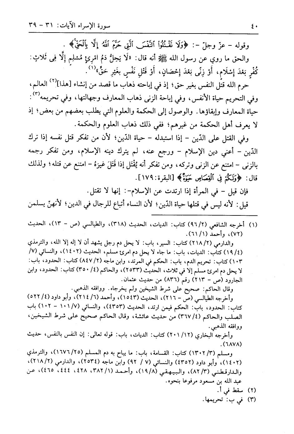 وقوله - عَزَّ وَجَلَّ -: (وَلَا تَقْتُلُوا النَّفْسَ الَّتِي حَرَّمَ اللَّهُ إِلَّا بِالْحَقِّ وَمَنْ قُتِلَ مَظْلُومًا فَقَدْ جَعَلْنَا لِوَلِيِّهِ سُلْطَانًا فَلَا يُسْرِفْ فِي الْقَتْلِ إِنَّهُ كَانَ مَنْصُورًا (33)