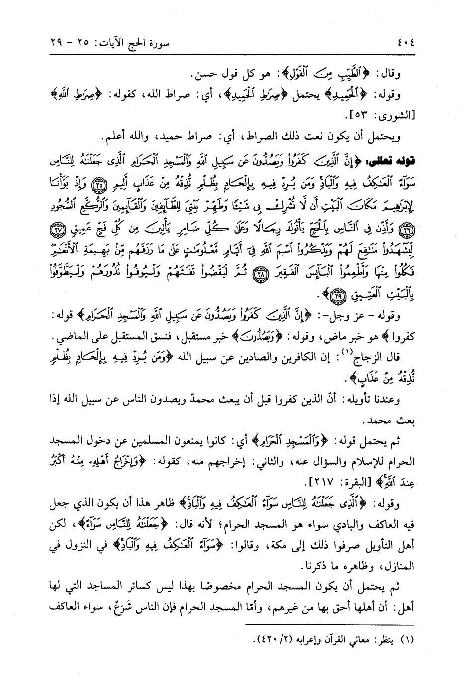قوله تعالى (إِنَّ الَّذِينَ كَفَرُوا وَيَصُدُّونَ عَنْ سَبِيلِ اللَّهِ وَالْمَسْجِدِ الْحَرَامِ الَّذِي جَعَلْنَاهُ لِلنَّاسِ سَوَاءً الْعَاكِفُ فِيهِ وَالْبَادِ وَمَنْ يُرِدْ فِيهِ بِإِلْحَادٍ بِظُلْمٍ نُذِقْهُ مِنْ عَذَابٍ أَلِيمٍ (25) وَإِذْ بَوَّأْنَا لِإِبْرَاهِيمَ مَكَانَ الْبَيْتِ أَنْ لَا تُشْرِكْ بِي شَيْئًا وَطَهِّرْ بَيْتِيَ لِلطَّائِفِينَ وَالْقَائِمِينَ وَالرُّكَّعِ السُّجُودِ (26) وَأَذِّنْ فِي النَّاسِ بِالْحَجِّ يَأْتُوكَ رِجَالًا وَعَلَى كُلِّ ضَامِرٍ يَأْتِينَ مِنْ كُلِّ فَجٍّ عَمِيقٍ (27) لِيَشْهَدُوا مَنَافِعَ لَهُمْ وَيَذْكُرُوا اسْمَ اللَّهِ فِي أَيَّامٍ مَعْلُومَاتٍ عَلَى مَا رَزَقَهُمْ مِنْ بَهِيمَةِ الْأَنْعَامِ فَكُلُوا مِنْهَا وَأَطْعِمُوا الْبَائِسَ الْفَقِيرَ (28) ثُمَّ لْيَقْضُوا تَفَثَهُمْ وَلْيُوفُوا نُذُورَهُمْ وَلْيَطَّوَّفُوا بِالْبَيْتِ الْعَتِيقِ (29)
