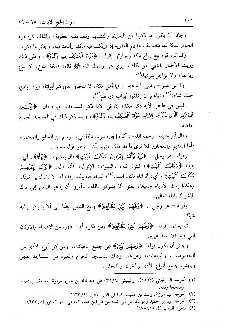 وقد كره قوم بيع رباع مكة وإجارتها بقوله: (سَوَاءً الْعَاكِفُ فِيهِ وَالْبَادِ)، وعلى ذلك رويت الأخبار بالنهي عن ذلك، روي عن رسول اللَّه - صَلَّى اللَّهُ عَلَيهِ وَسَلَّمَ - قال: " مكة مناخ، لا يباع رباعها، ولا يؤاجر بيوتها ".