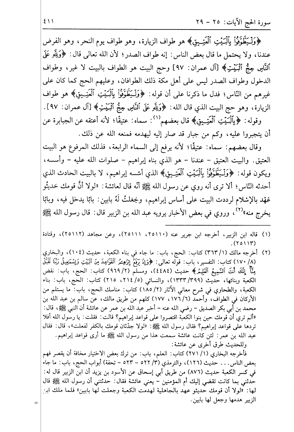 (وَلْيَطَّوَّفُوا بِالْبَيْتِ الْعَتِيقِ) هو طواف الزيارة، وهو طواف يوم النحر، وهو الفرض عندنا، ولا يحتمل ما قال بعض الناس: إنه طواف الصدر؛ لأن اللَّه تعالى قال: (وَلِلَّهِ عَلَى النَّاسِ حِجُّ الْبَيْتِ)، وحج الببت هو الطواف بالبيت لا غير، وطواف الدخول وطواف الصدر ليس على أهل مكة ذلك الطوافان، وعليهم الحج كما كان على غيرهم من النّاس؛ فدل ما ذكرنا على أن قوله: (وَلْيَطَّوَّفُوا بِالْبَيْتِ الْعَتِيقِ) هو طواف الزيارة، وهو حج البيت الذي قال اللَّه: (وَلِلَّهِ عَلَى النَّاسِ حِجُّ الْبَيْتِ). وقوله: (بِالْبَيْتِ الْعَتِيقِ) قَالَ بَعْضُهُمْ: سماه: عتيقًا؛ لأنه أعتقه عن الجبابرة عن أن يتجبروا عليه، وكم من جبار قد صار إليه ليهدمه فمنعه اللَّه عن ذلك.