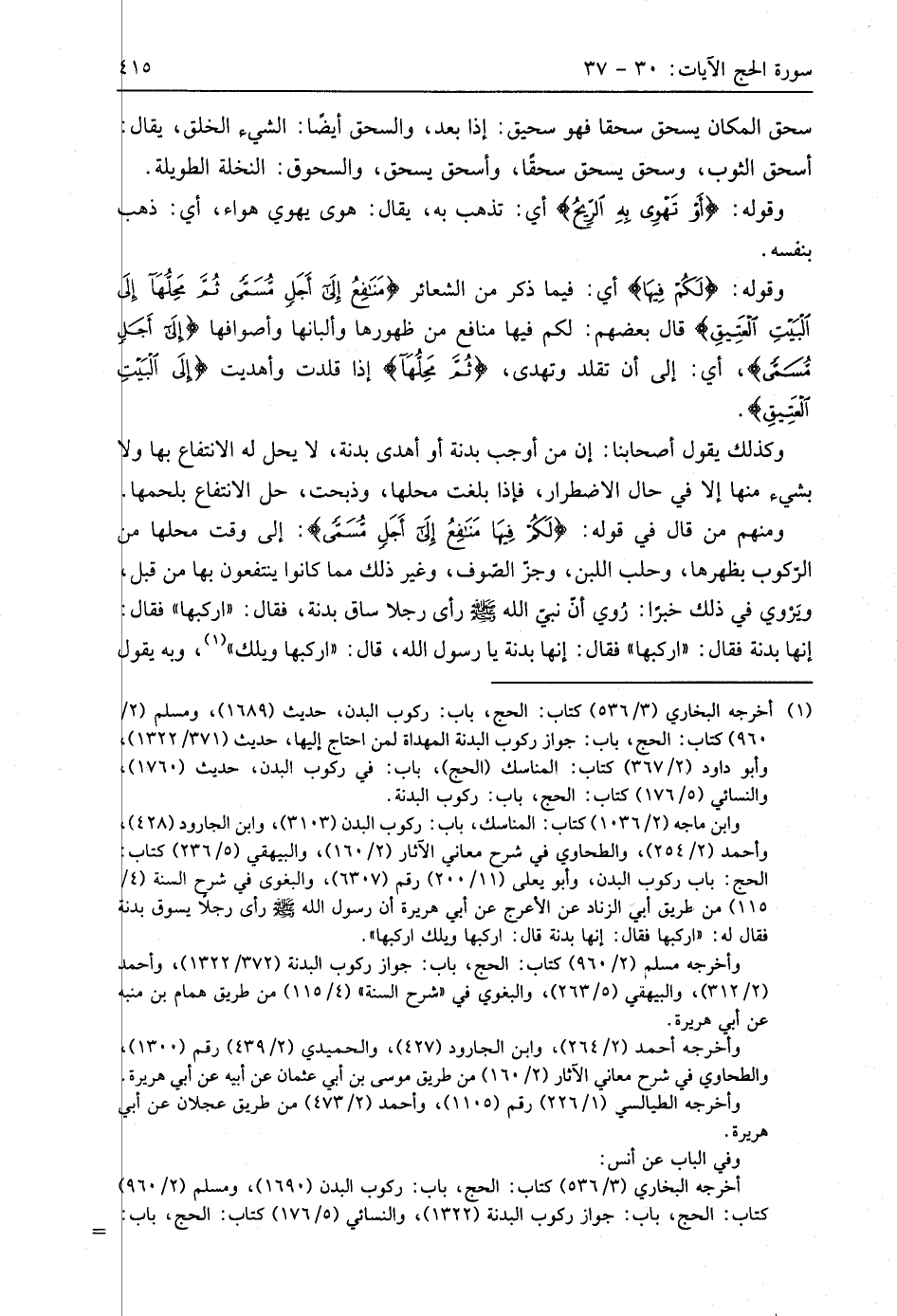 ومنهم من قال في قوله: (لَكُمْ فِيهَا مَنَافِعُ إِلَى أَجَلٍ مُسَمًّى): إلى وقت محلها من الركوب بظهرها، وحلب اللبن، وجز الصوف، وغير ذلك مما كانوا ينتفعون بها من قبل، ويروي في ذلك خبرًا: رُوي أن نبي اللَّه - صَلَّى اللَّهُ عَلَيهِ وَسَلَّمَ - رأى رجلا ساق بدنة، فقال: " اركبها " فقال: إنها بدنة فقال: " اركبها " فقال: إنها بدنة يا رسول اللَّه، قال: " اركبها ويلك "، وبه يقول